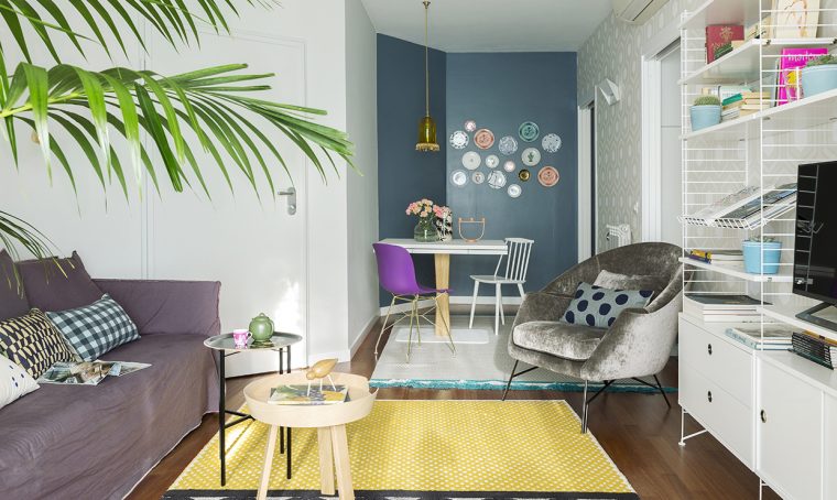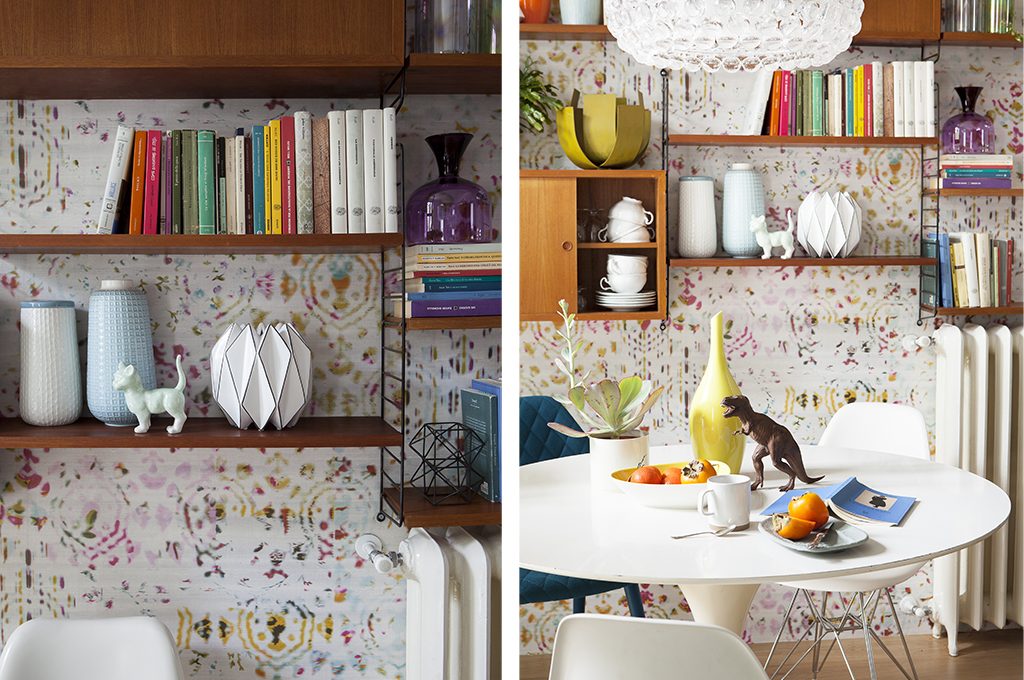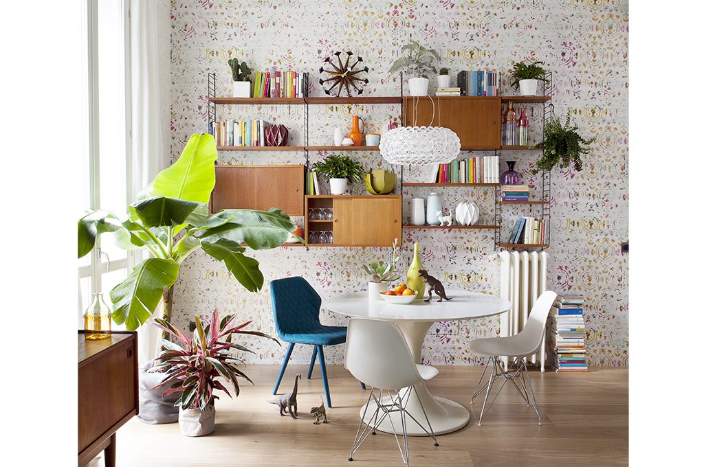 Sedie bianche DSR Eames Plastic Chair di Vitra €257,42 e Ava 1690 in tessuto turchese di Bross. Sulla libreria, una String del 1959 presa online da un antiquario belga roark.be, vasi in vetro Paola C, in ceramica Royal Doulton e in ferro verde Antonino Sciortino. Orologio Vitra. Piante Fratelli Ingegnoli.