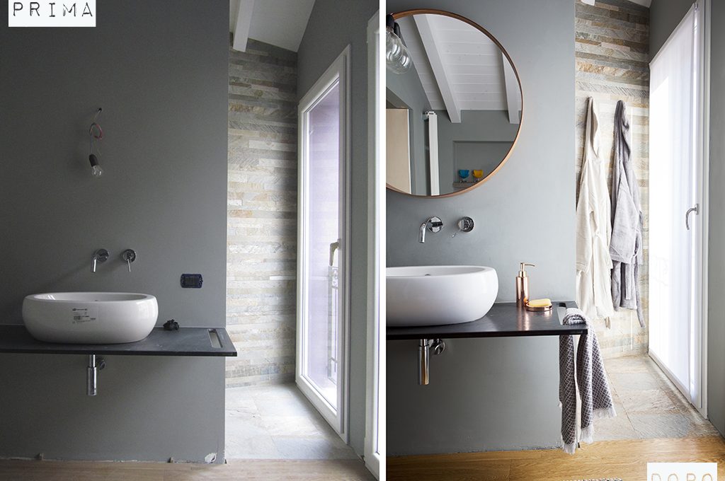 Il grigio del bagno è ‘scaldato’ dallo specchio in legno [Stockholm Ikea €79,99] e dai portasapone in rame [Coincasa]. Accappatoi [Fazzini €79,90], tappeto [Ilaria.I cm 60x140 €230].