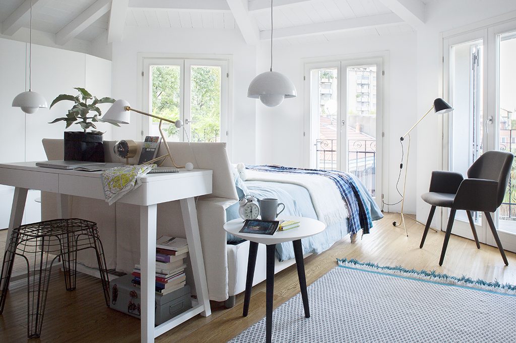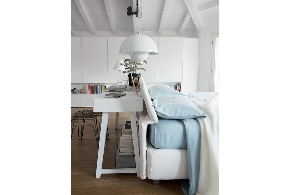 Lenzuola [Fazzini €195 la parure, €95 il lenzuolo con angoli]. Lampade a sospensione Flowerpot VP1 [&Tradition €199 su trend-house.it]. Armadio su misura con vano libreria [Falegnameria Fallacara].
