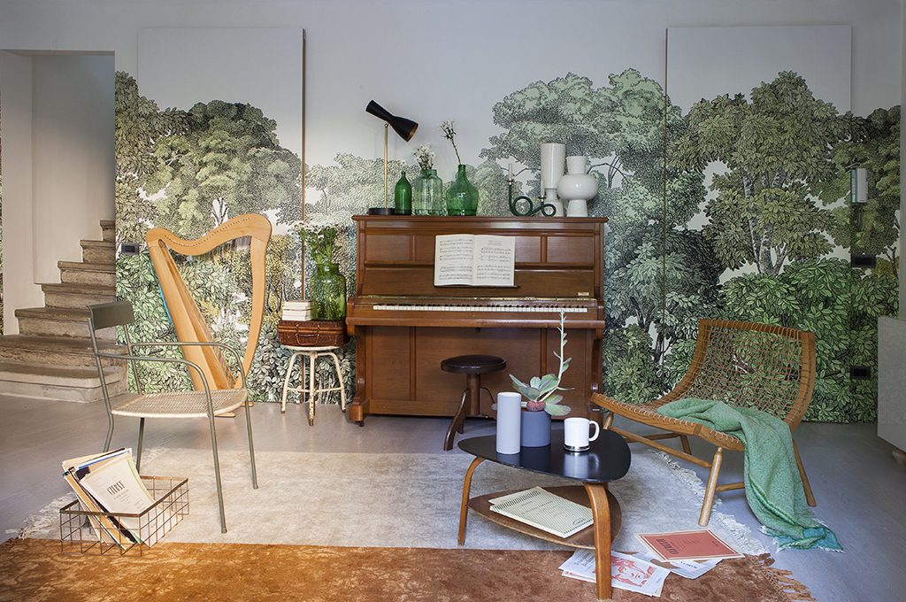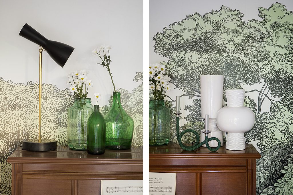 Il ripostiglio e la lavanderia sono chiusi da due pannelli scorrevoli che ‘scompaiono’ tra le fronde di un ‘bosco’: la carta da parati (qui è Bellewood di Rebel Walls) può fare veri trucchi di magia!
