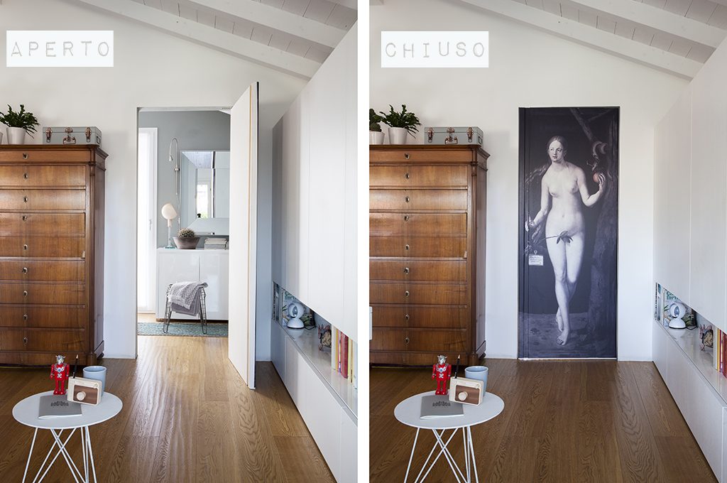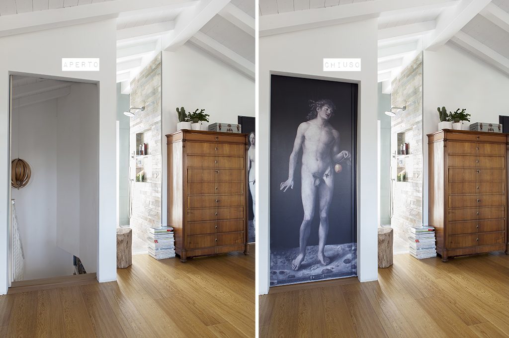 Le porte della camera matrimoniale (quella di accesso e del bagno) sono state rese protagoniste coprendole con due dipinti di Albrecht Durer, Adamo ed Eva, riprodotti con Wallpaper on Demand di Jannelli & Volpi.