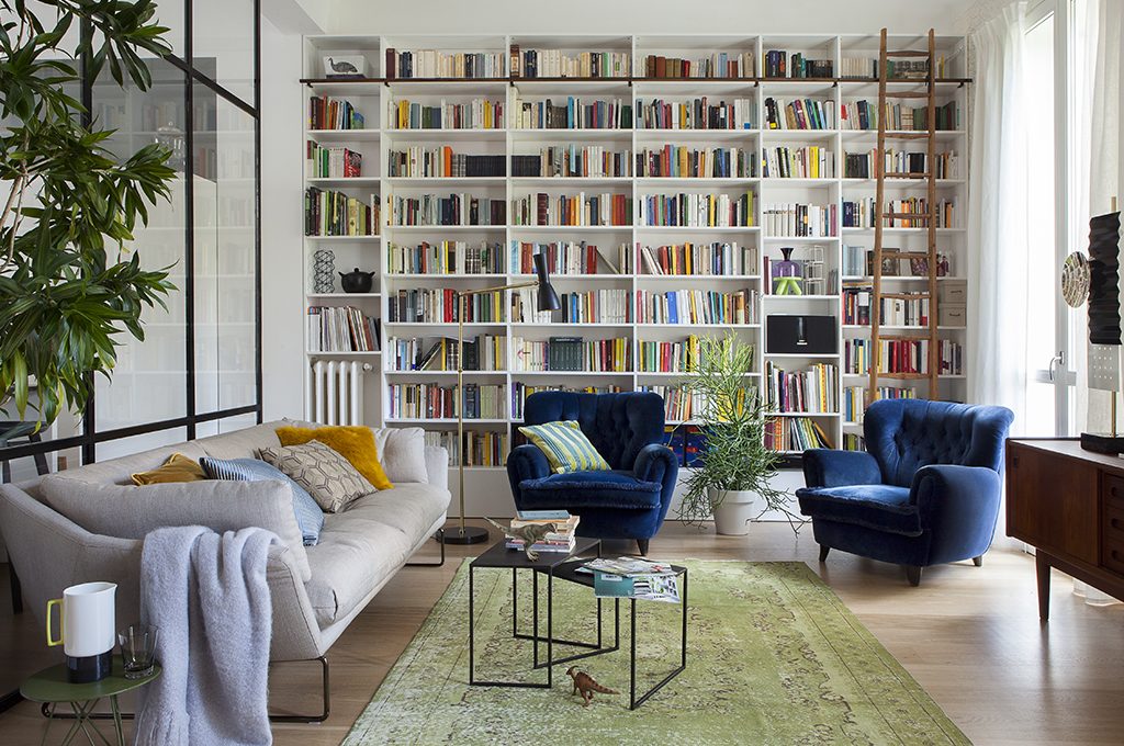 La libreria a tutta altezza [Falegnameria Fallacara] si impone, insieme alle Divano New York Suite [Saba Italia, cm 230x100x70h], tappeto [Sirecom, cm 180x262 €1.398] cuscini Coincasa, Colefax&Fowler e Jab. Tavolini di Antonino Sciortino.