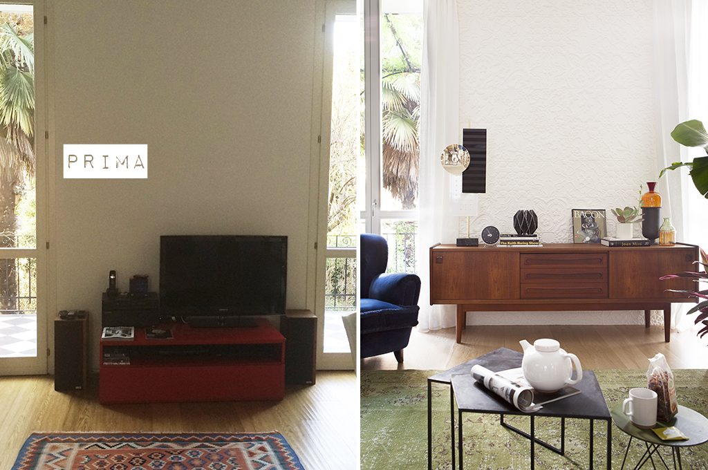 Il vecchio mobile tv è stato sostituito da un 'sideboard', la tipica madia nordica, preso in Danimarca tramite Lack00danishlab che importa mobili vintage nordici. Sulla parete, rivestimento murale Alhambra collez. L’Original [Élitis €237/m il rollo da cm 123h].