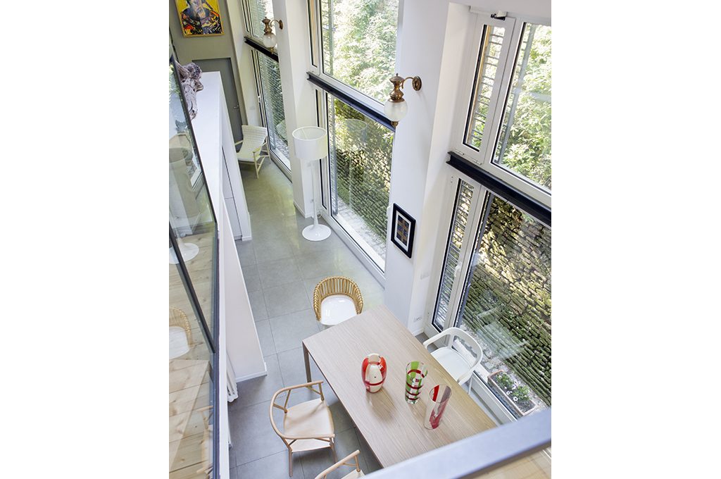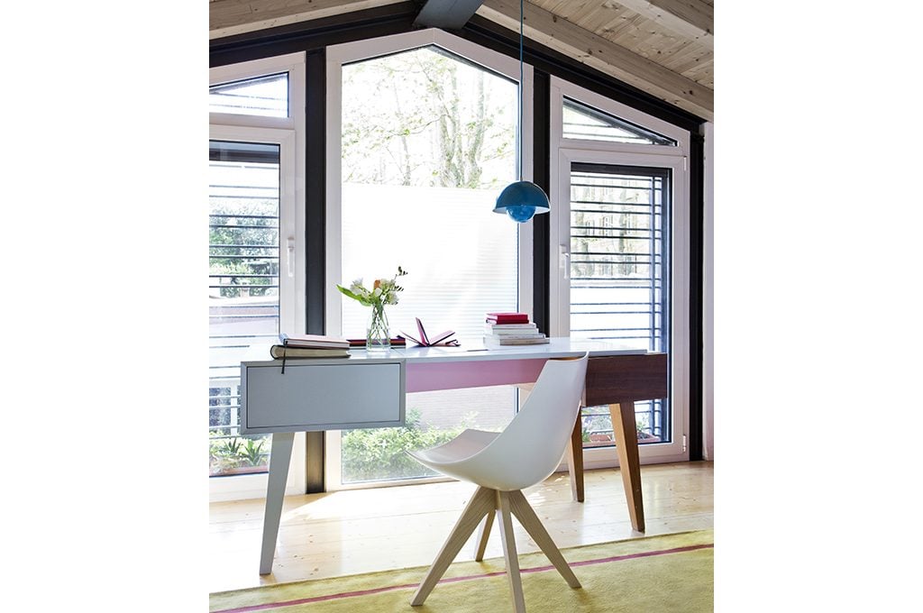 Lo studio è ricavato sul soppalco del living. Davanti alla grande finestra, scrittoio Coiffeuse [Secondome, cm 160x73x 75h €5.856] con oggetti di Fabriano Boutique e DOM più luce a sospensione Flowerpot VP1 [&Tradition €199]. tappeto Siesta [GT Design, cm 200x300 €1.450].