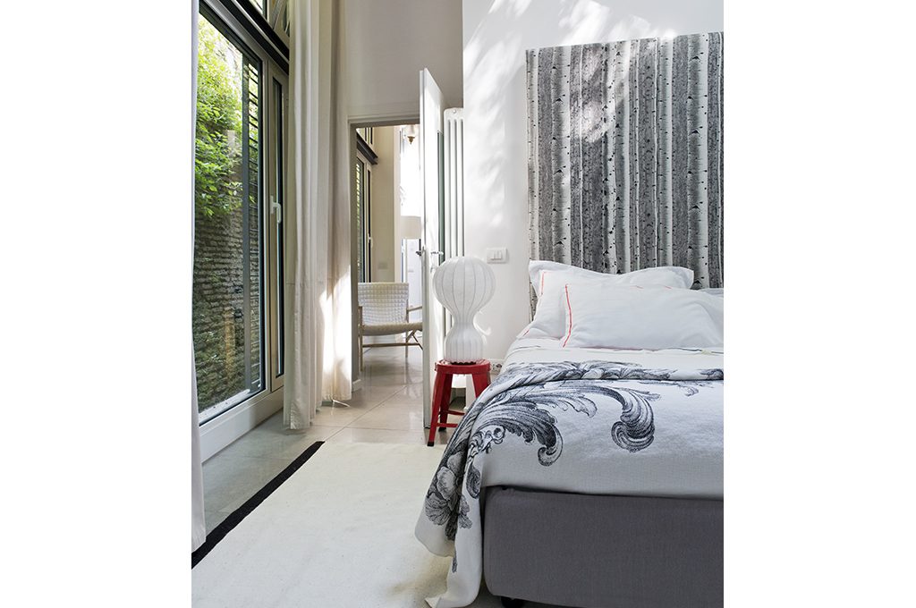 Il letto a sommier è stato completato da una testata alta 2 metri, rivestita con il tessuto Winter Wonderland decorato a betulle in bianco e nero [Carlucci, cm 150h €99,90/m], alla quale sono appoggiati guanciali con federe Lampo in lino di Fazzini. A terra, tappeto Whiteout in lana [GT Design, cm 200x250 €350] e sgabellino rosso [Mia Via Ripetta €89] che ospita la lampada Gatto [Flos, cm 56h €320].