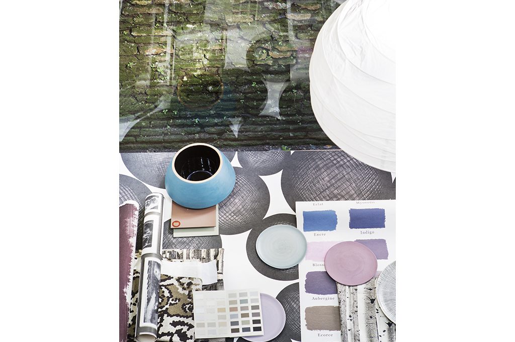 Sul tavolo, vestito con il pannello murale a bolle nere, sono appoggiati, da sin.: 2 rolli di carta da parati Toile Peint [Elitis, m 10x70 cm €136] e Museum [Andrew Martin, 3 rolli da m 10x68 cm €470], i tessuti Nomade [Chivasso, cm 140h €99,90/m] e di Art&Decor, la tappezzeria con decoro a tavolozza di colori Paint [Casadeco, m 10x50 cm €150/rollo], il tessuto con betulle Winter Wonderland [Carlucci, cm 150h €99,90/m], tutto da JVD. Piatti in grès dipinto a mano in toni pastello di Rina Menardi, vaso azzurro Atollo [L’Arte nel Pozzo €292], cartelle colore in vendita da Il Ladro di Fragole.