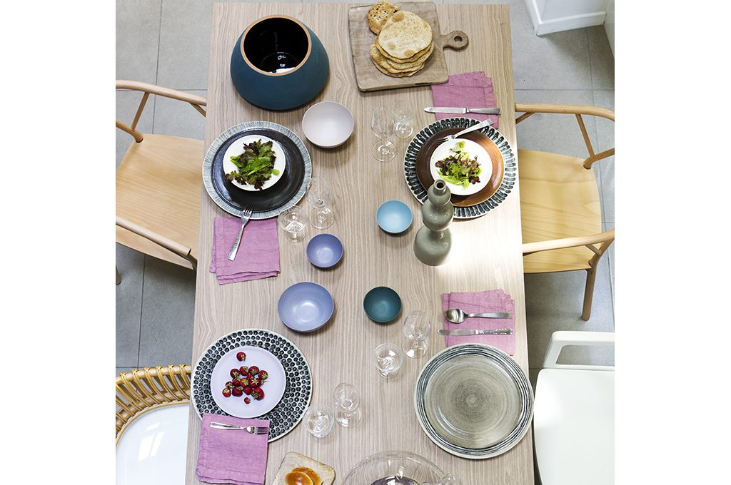 Sul tavolo in legno, l’apparecchiatura è semplice e raffinata: i sottopiatti in bianco e nero Lapis [DMK, Ø cm 35,5 €130 cad] accolgono piatti in grès marrone [L’Arte nel Pozzo, Ø cm 31 €50 l’uno] e in colori pastello, come le ciotoline [Rina Menardi da €35 cad]. Tovaglioli rosa [La Fabbrica del Lino], candelabro grigio [Bosa], calici [Bormioli Rocco], tagliere e posate [Emporio Roma].