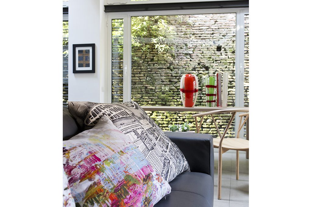 Il divano grigio è vivacizzato dai cuscini multicolor Desire [Romo, da €110 cad] e a stampa in bianco e nero [Art&Decor €200 cad] tutti in vendita da JVD.