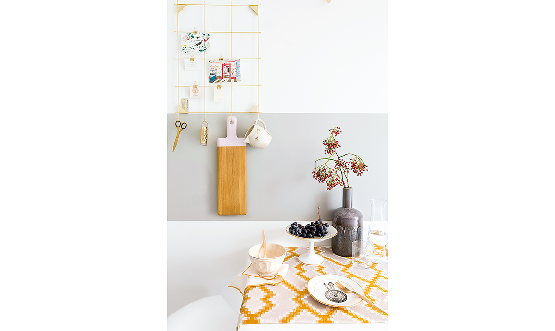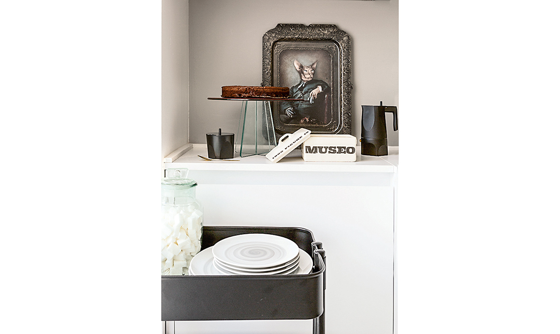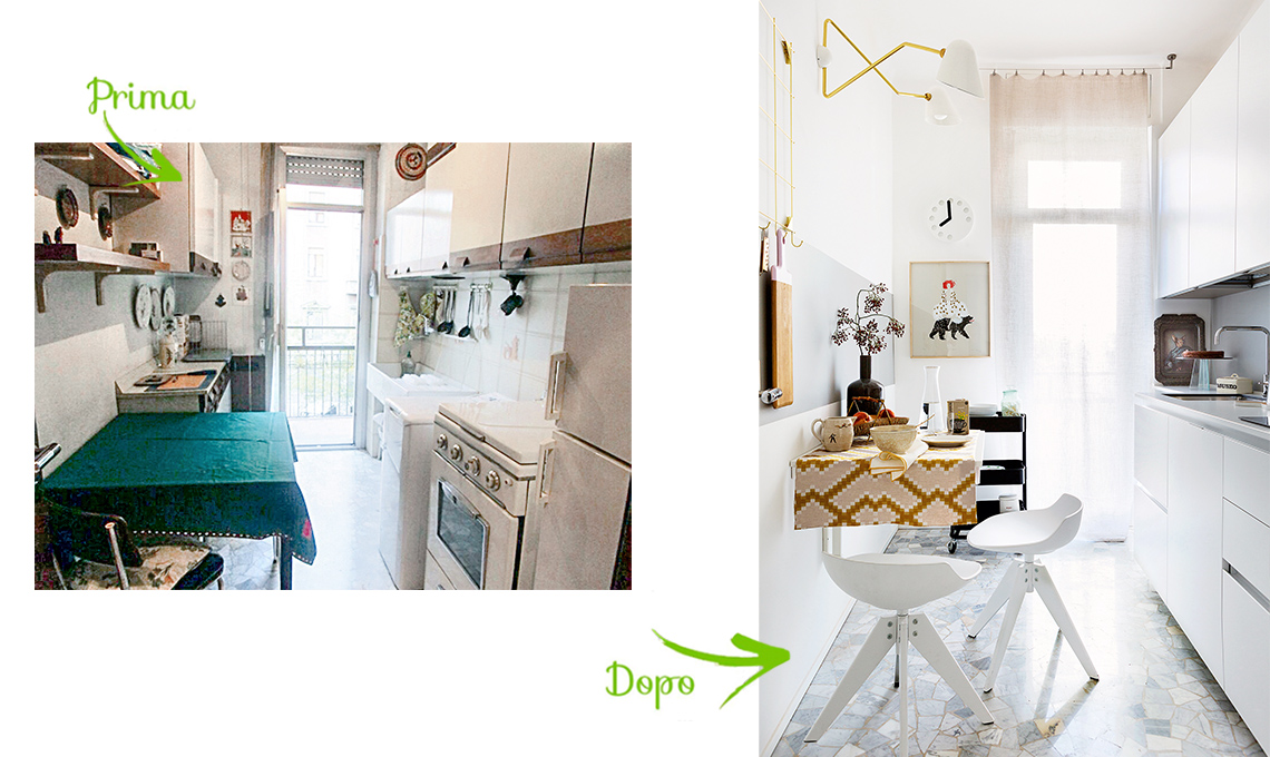 La cucina era sovraffollata e datata: mobili vecchi e rovinati più piastrelle bianche a tutta altezza toglievano personalità al locale. L’ambiente è stato organizzato su un’unica parete con moduli essenziali e bianchi, sull’altra un piano a ribalta e accessori su ruote da spostare dove servono. Tutto è più luminoso e si raccorda con la palladiana restaurata del pavimento. La lampada da parete in ottone cattura lo sguardo appena si entra, ed è ripresa nelle finiture dalla bacheca sopra al tavolo a ribalta. Anche la mise en place si fa preziosa, con tessuti e stoviglie dal gusto vintage. Al posto delle piastrelle, le pareti tra basi e pensili e sopra il tavolo sono tinte con una striscia in smalto grigio chiaro.