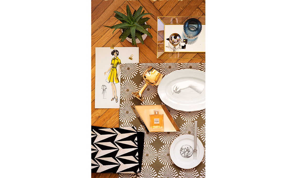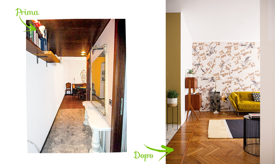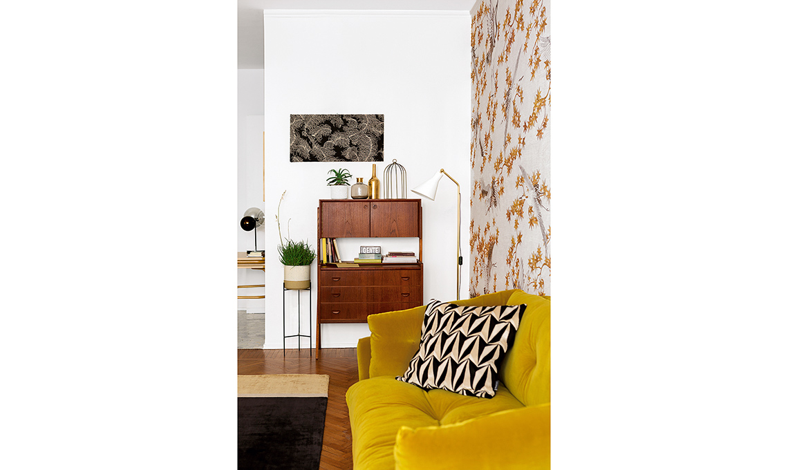 La proprietaria di casa voleva un soggiorno dall'effetto teatrale e d'impatto. Largo agli arredi vintage originali da accostare a pezzi moderni ma di ispirazione Fifties. Il progetto del living ruota attorno alla tappezzeria in stile giapponese che ha guidato tutte le scelte per quel che riguarda i colori. Il giallo senape del divano, il tono delle pareti dello studio e della madia nordica, il giallo del lino delle tende e il tappeto; il tutto reso ancor più raffinato dai tocchi dorati di lampade e tavolini.