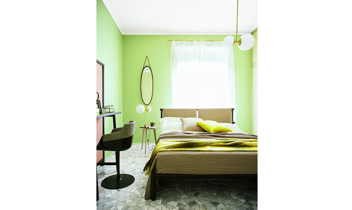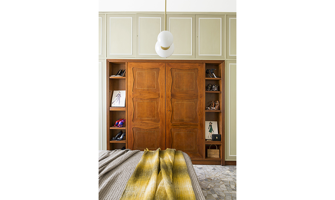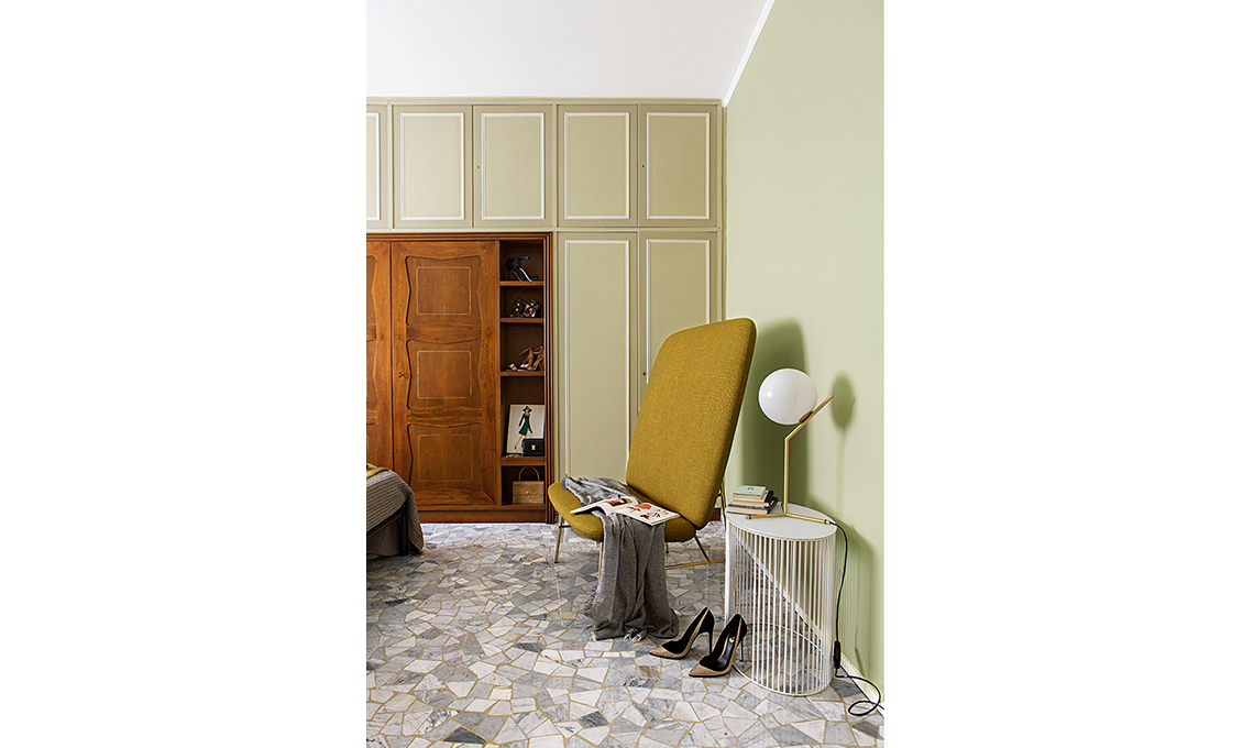 La camera è tutt’altro rispetto alla zona giorno. I colori sono totalmente diversi e suggeriti dai toni delle ante del grande armadio creato su misura e lasciato dalla vecchia proprietaria. La parte centrale in noce scuro ha dei vani a giorno che si sono rivelati perfetti per la collezione di scarpe e bozzetti originali scovati in un mercatino. Tutto il resto, mobile beauty a parte che è in un raffinato rosa, è grigio-verde, dalle pareti al pannello del letto, alla poltroncina. Spiccano i tocchi dorati dati dalle luci.
