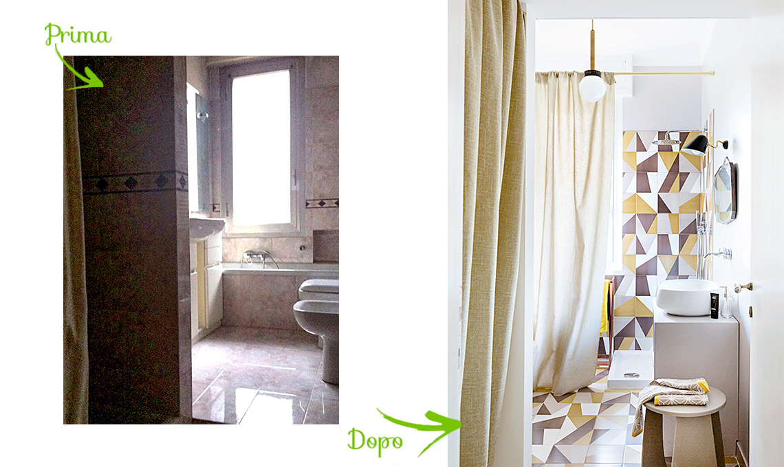 Il bagno risaliva agli Anni ’80: smantellati pavimenti e sanitari, ora ha uno stile easy ma moderno, con piccoli tocchi vintage. Anche qui vengono ripresi i colori della casa: sfumature di giallo senape in contrasto con il grigio.