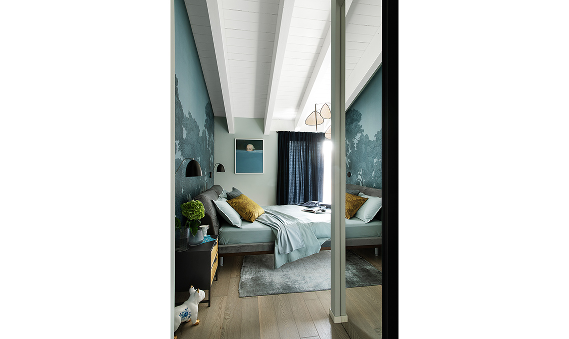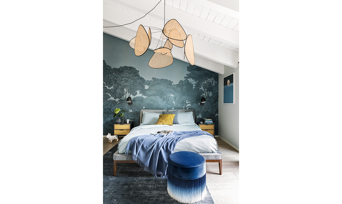 Tappezzeria Bellewood Solid Blue [Rebel Walls € 45/mq]; ai lati del letto Settanta [Dall’Agnese], applique Alexander [Nordlux] e comodini Kyoko in metallo nero e paglia di Vienna [cm 50x38x51h € 225 cad] con vasi Bachar [da € 10 cad], tutto [Kave Home], e tazze [L’Abitare], tende [La Redoute].