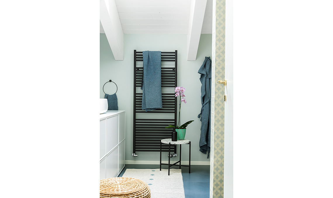 Scaldasalviette Aura [Zehnder], pouf Alabama Coco e tavolino terrazzo [Casa, ø cm 41x41h €50eøcm40x40h€29,95].set asciugamani, telo bagno e accappatoio Memoria in cotone a nido d’ape Indaco certificati GOTS [Somma1867 € 24 il set 1+1, € 36 il telo e € 69,50 l’accappatoio], passatoia Peg [Pappelina] e portasalviette Towel Hanger [Ferm Living € 35]. piastrelle nella doccia Madelaine Decor 5 [Self Style] e a terra