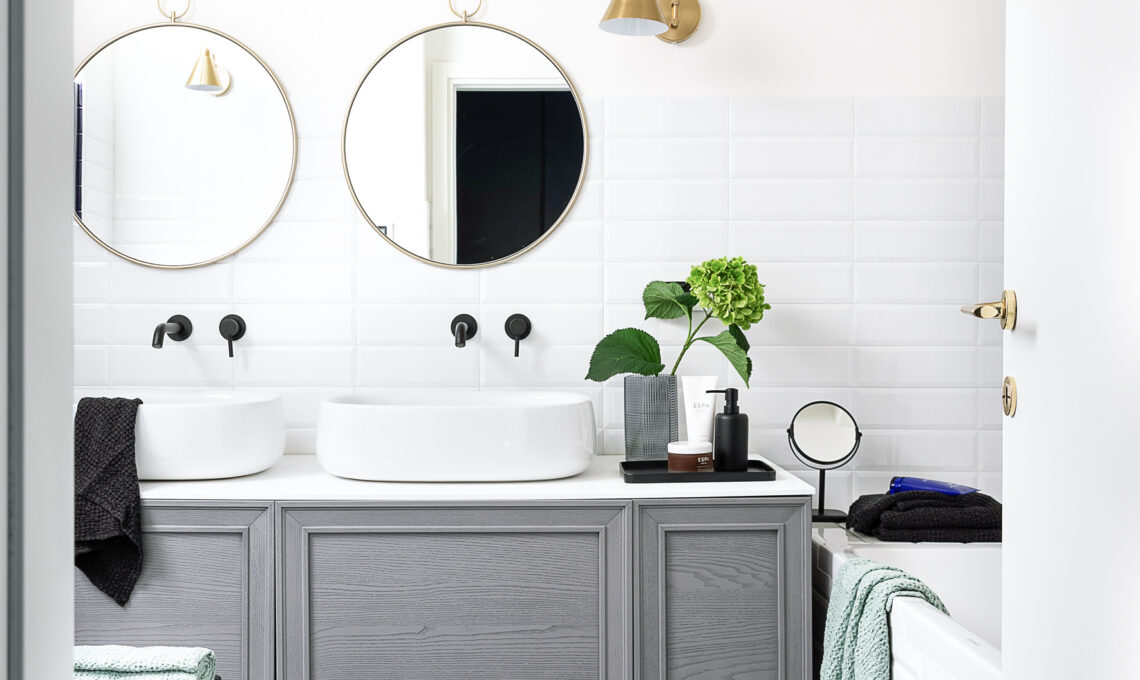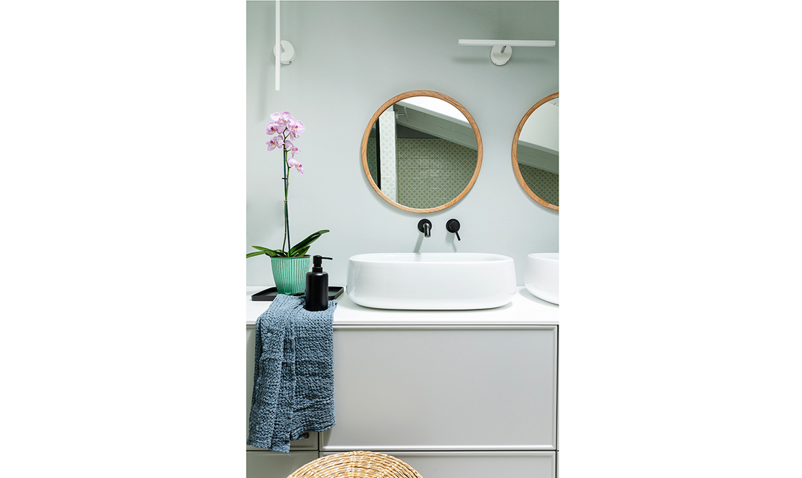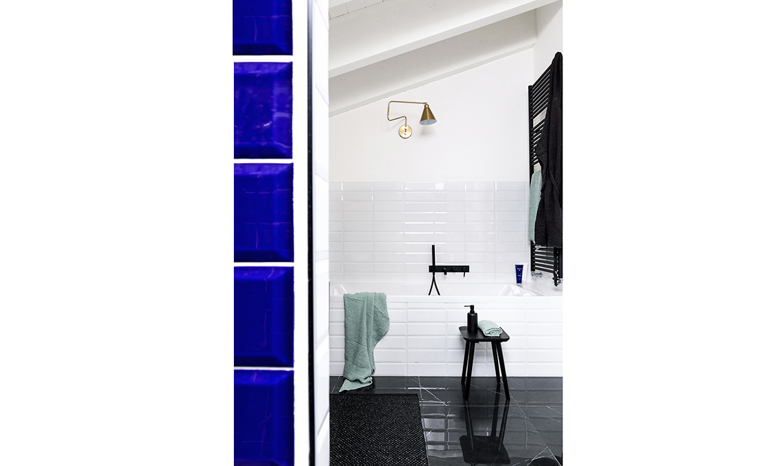 e rubinetteria Nostromo nero [Fantini]. specchi da parete Loop e appliques Game [House Doctor]. piastrelle a parete [Decor Union 2000] e a terra [Ceramica Magica].