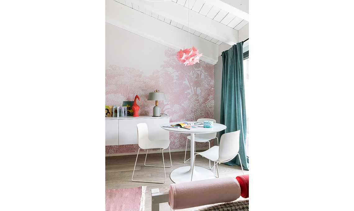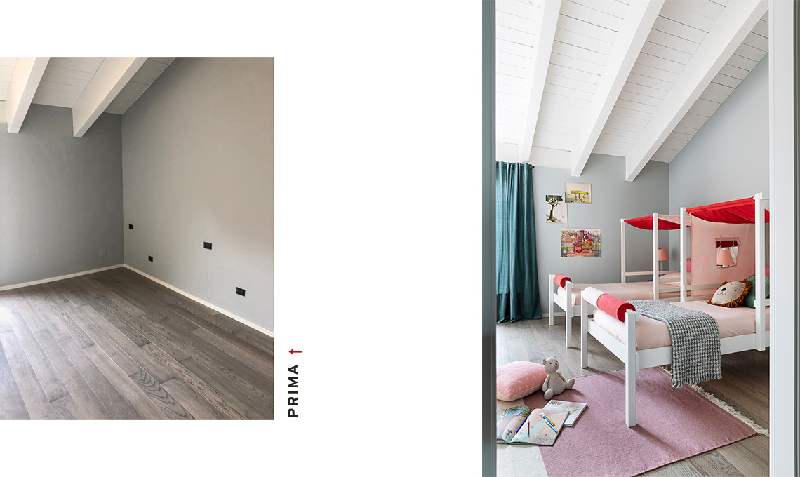 I colori, le finiture, la cucina, armadi e librerie, oltre a divano e letti erano già stati definiti:Vanessa è intervenuta con tessili, quadri, decori, complementi e carte da parati per ammorbidire e personalizzare ogni stanza. Seguendo e arricchendo la palette di colori del cuore di Silvia & family.