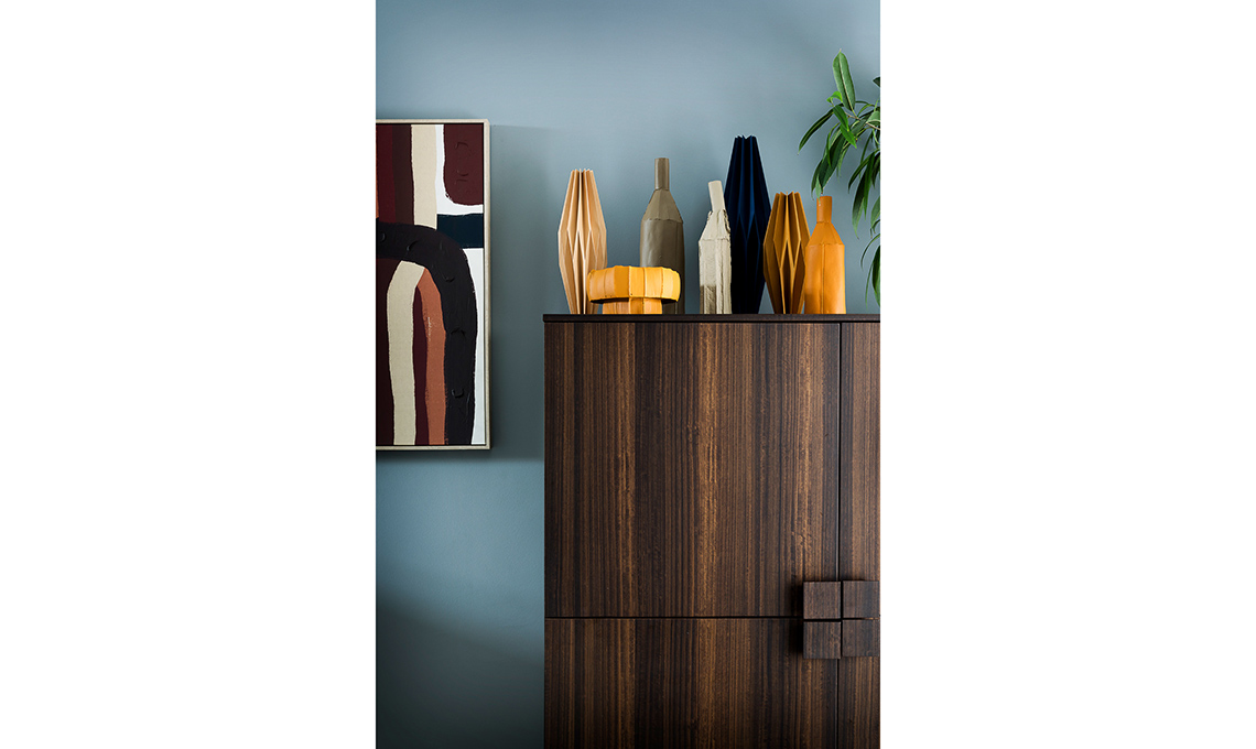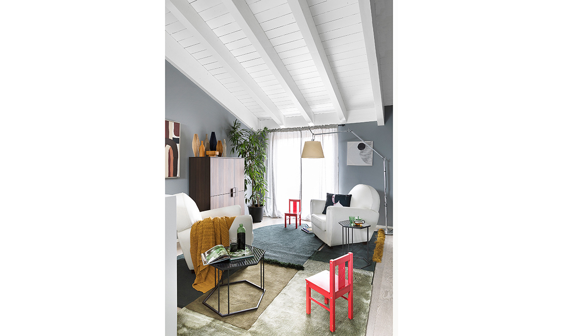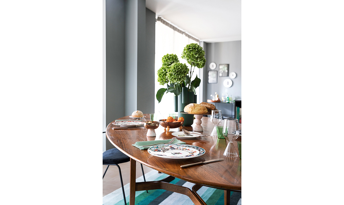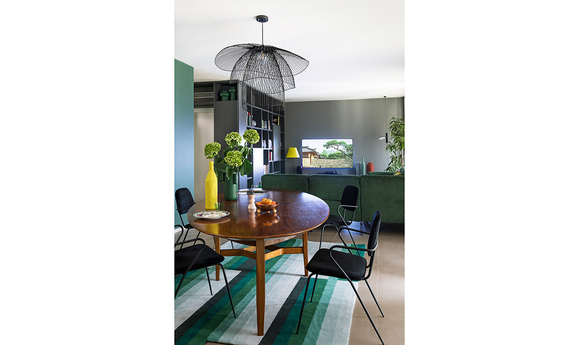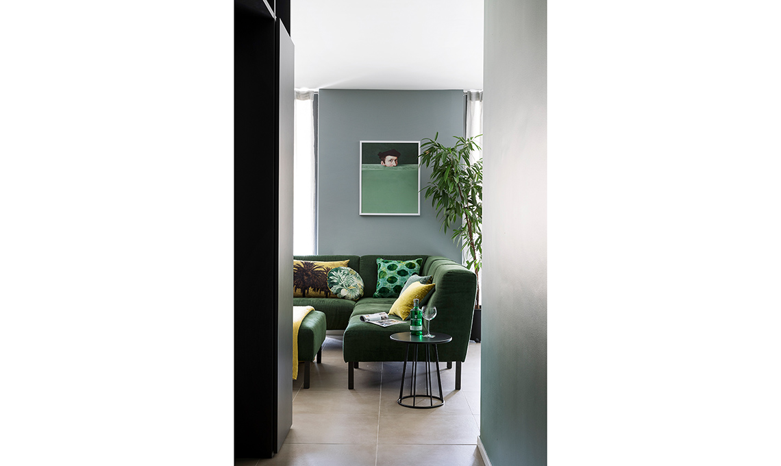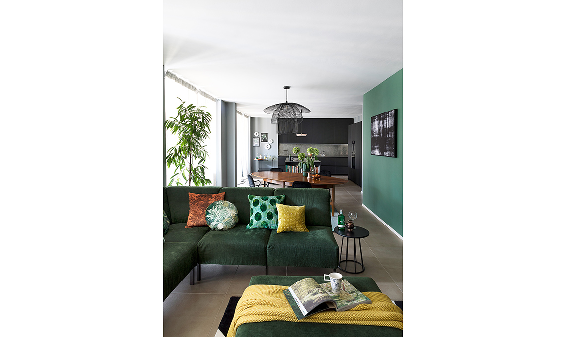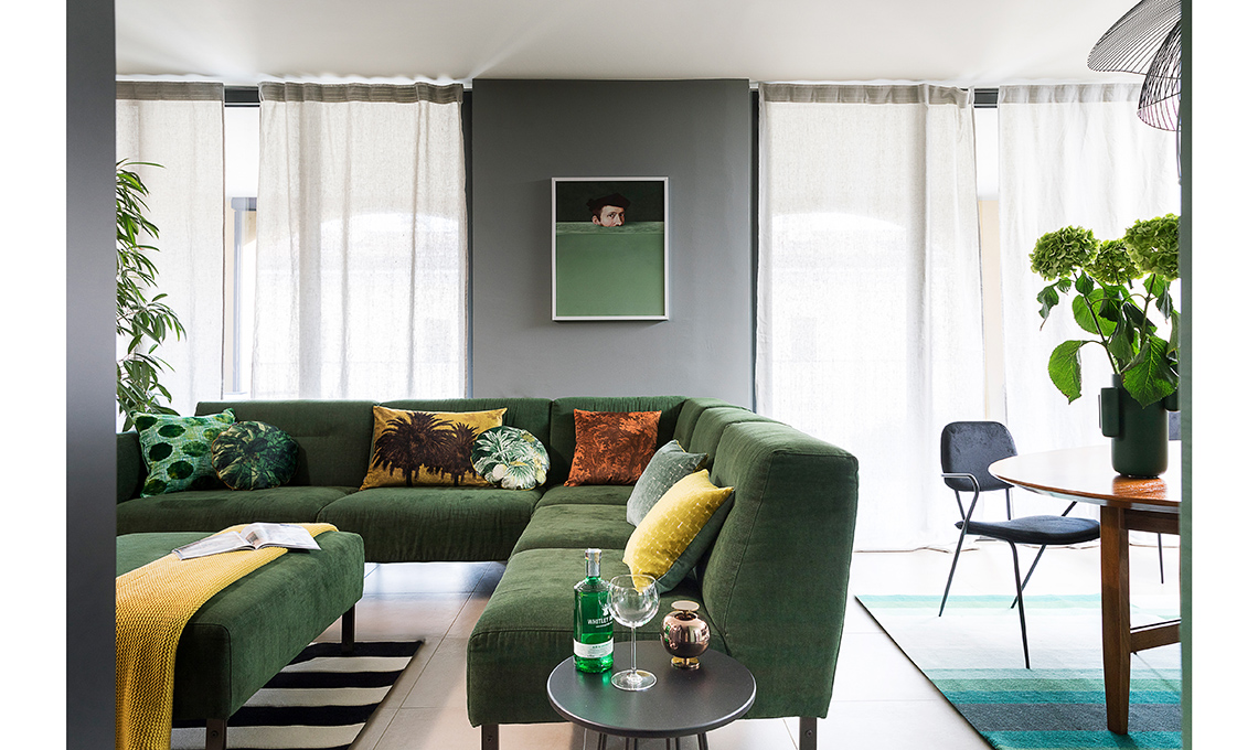 «Il verde in tante nuances è il colore base della zona giorno, declinato in tinte unite e pattern geometrici. Innovativo l’abbinamento con il grigio fumo di Londra; semplice e geniale il tocco di giallo che porta luce nella palette».