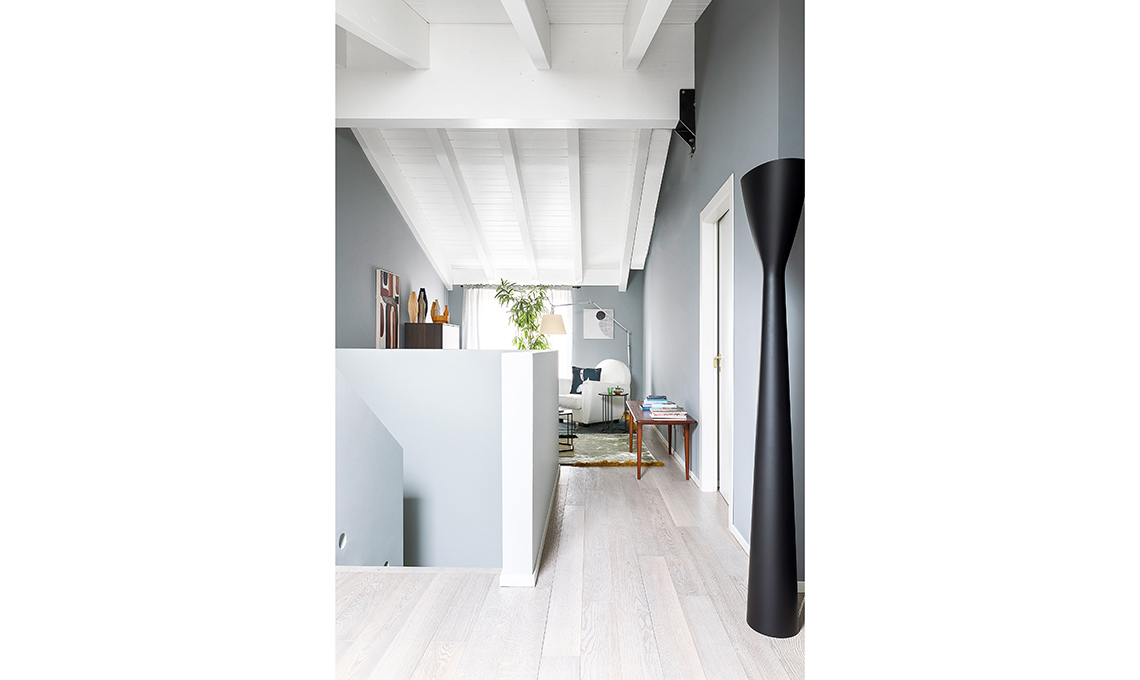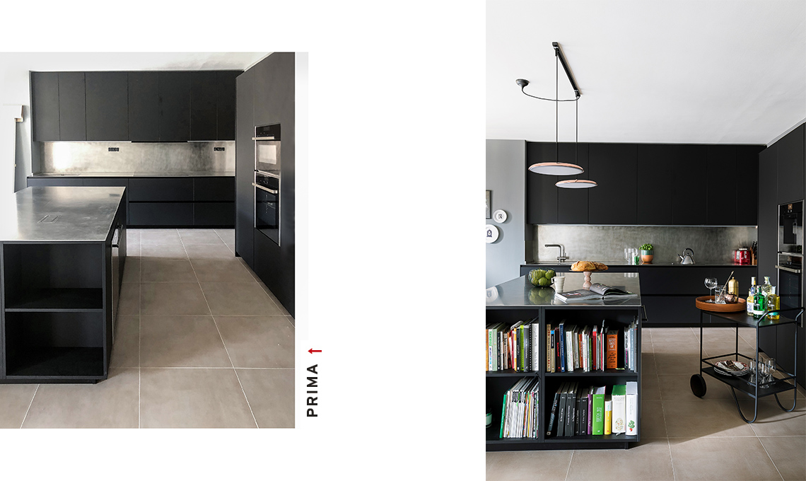 Con l’architetto Maria Cagnoli si decide di rivedere la distribuzione dei locali creando un maxi living con cucina a vista e tanti spazi di servizio al piano di sotto, e di realizzare al piano di sopra due suite senior e junior con spazi relax in comune.