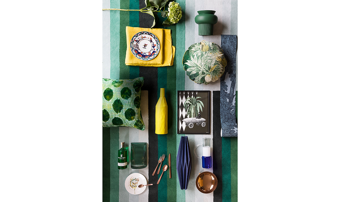 Piatti piani Stack Funk Plates e dessert Undercover Imari Plates [Mineheart € 37,48 e da € 21,08 cad], posate Taste in acciaio inox pvd [€ 198,99 il servizio da 24] di [Sambonet] come la ciotola Penelope, tovaglioli [Lisa Corti], calici trasparenti Tutù e bicchieri verdi High Rise [Ichendorf].