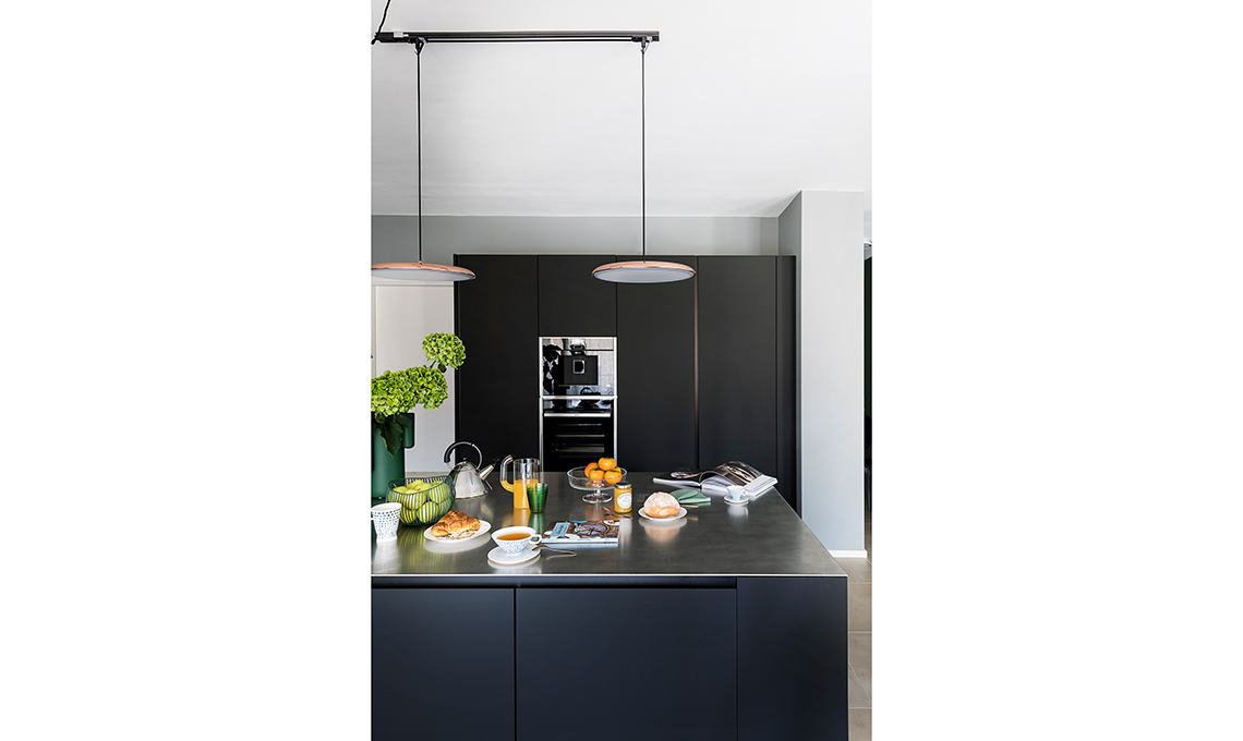 Sul top dell’isola illuminata da sospensioni Artist 25 [Nordlux], vaso Tubini [Calligaris, cm 33,5h € 161,50], portafrutta in metallo [Antonino Sciortino], bollitore in acciaio [Alessi € 125], caraffa e alzatina in vetro [Ichendorf], tazze [L’Abitare], posate [Sambonet], tovagliolo [Lisa Corti].