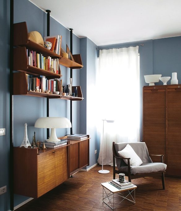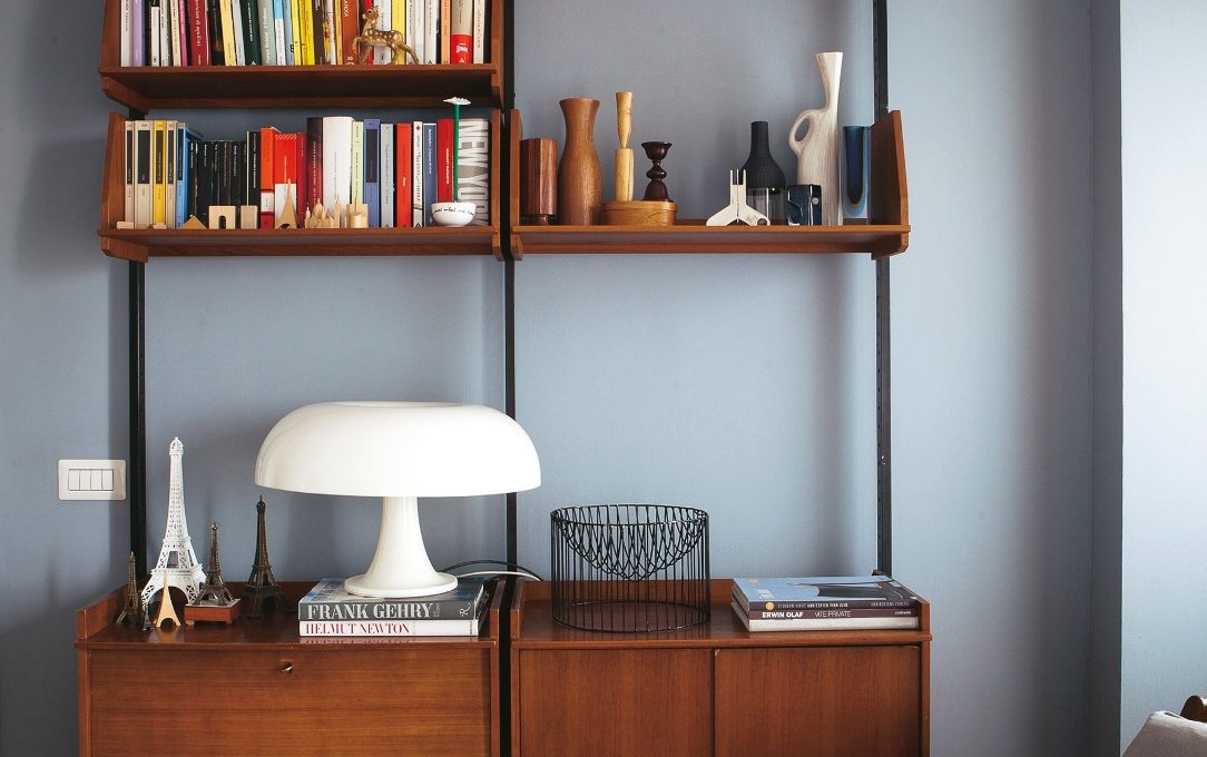 Protagonista del living è la libreria di gusto nordico degli Anni ’60, trovata in un negozio di mobili usati. È la cornice perfetta per le mie due mini collezioni: riproduzioni della Tour Eiffel (adoro Parigi!) e oggetti di epoche, forme e materiali diversi che mi diverto ad abbinare (come il candelabro di Paola C., il vaso di Industreal e la caraffa di Discipline). Lampada da tavolo Nesso di Artemide (€250). Vicino alla vecchia poltroncina rinnovata con il tessuto in lino Aina di Ikea (€7,99/m) ci sono il tavolino Occasional Table di Vitra (€233,53) e la piantana Tab di Flos (€230).