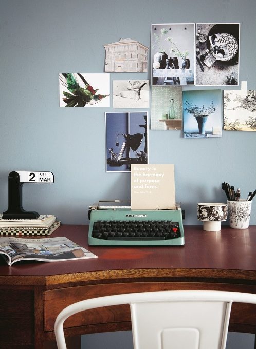 All’ingresso c’è la zona studio: alla scrivania vintage trovata in un mercatino ho accostato una sedia dal look industriale. Sul top, oltre alla mitica Lettera 32 di Olivetti, c’è il calendario Timor di Danese (€119).