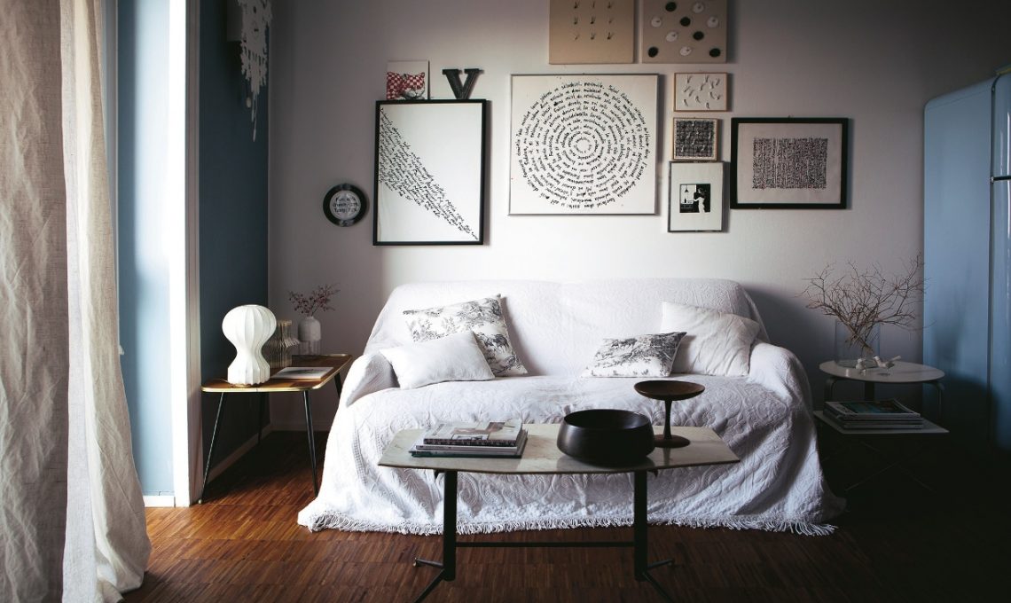 Di recupero anche il divano Raffles di De Padova: il rivestimento senape non mi piaceva, adagiandovi sopra un copriletto di piquet bianco e dei cuscini in Toile de Jouy è molto più nelle mie corde. Sul muro ho appeso i quadri del mio artista preferito... mio padre, Christopher Pisk! Le tele sono appese in modo da creare dei giochi di geometrie e di chiaroscuri.
