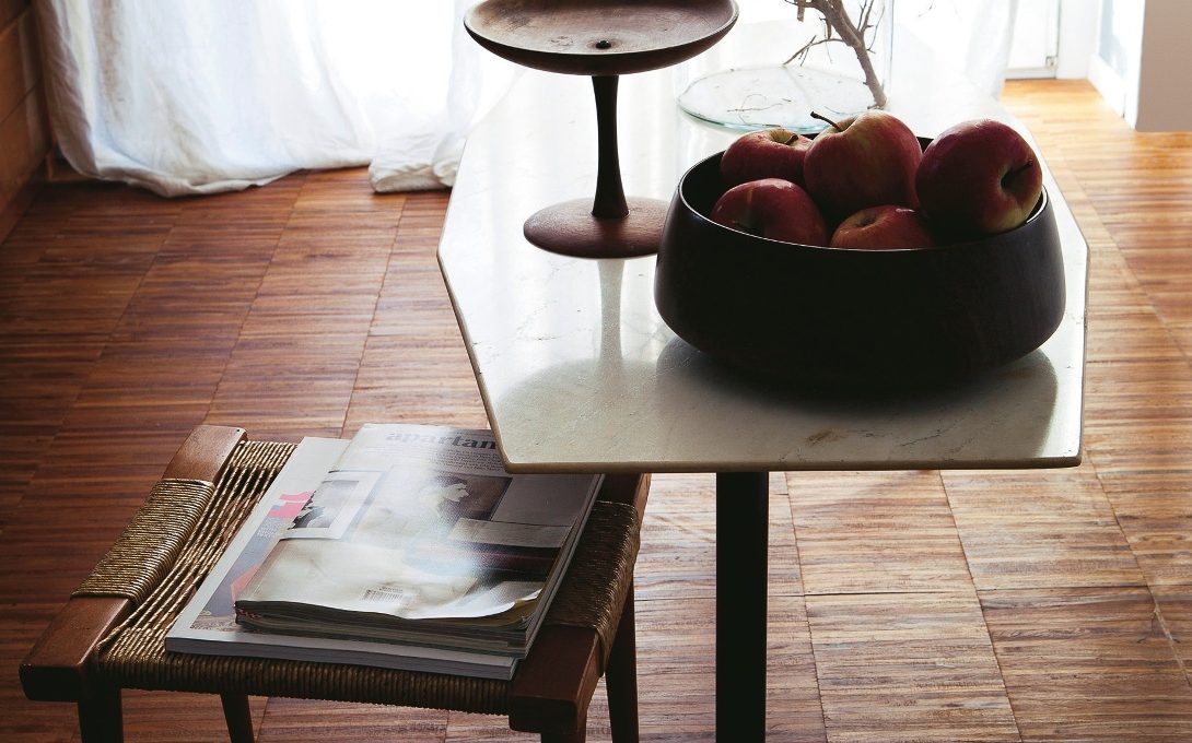 Amo i tavolini, forse non si era ancora capito... ma ne comprerei a bizzeffe! Perché sono utili (li uso spesso come mini-spazi espositivi) ma soprattutto perché li posso spostare in continuazione per creare nuovi ‘set’ in casa mia. Qui, ho fatto un groupage di due pezzi vintage, regali di amici: anche se di stili diversi, trovo che assieme siano perfetti. Nella foto a sinistra, accanto al divano c’è il più moderno Dan di De Padova (Ø cm 48x42h €340) con top bianco e base in alluminio. A terra ho voluto un parquet industriale con listelli in tante essenze diverse: mi piaceva l’idea di camminare su un pavimento naturale e non verniciato, per un effetto il più grezzo e caldo possibile.