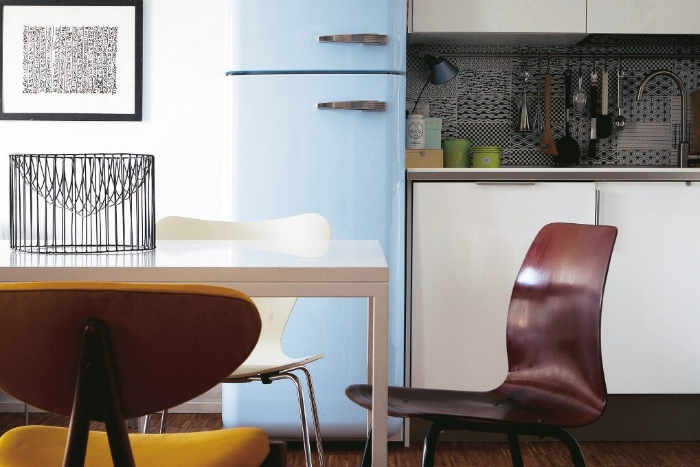Mi piace cucinare e, avrei preferito una cucina grande e separata ma... non si può avere tutto. La zona cottura è sì ampia, ma bianca e minimale (Abstrakt di Ikea) perché non risultasse invasiva. D’impatto, invece, il frigo Fifties di Smeg (FAB30RAZ1 €1.659), azzurro come le pareti del soggiorno. Per pranzare, prima avevo pensato a un bancone snack. Bello, sì, tanto che l’avevamo usato in un set con Ikea. Alla fine, ho scelto il classico tavolo: è più conviviale. È il mod. L’essenziale Fronzoni di Cappellini (cm 100x100 €1.030) che ho circondato con sedie di design recuperate, più la mitica 3107 di Arne Jacobsen bianca (da Mc Selvini, cm 55x 44x78h da €367).