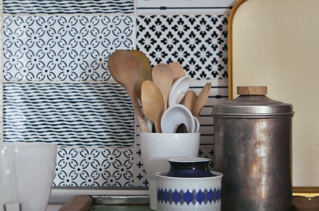 L’unico ‘sgarro’ che mi sono concessa al total white della cucina è il rivestimento della fascia tra basi e pensili. Ho scelto delle piastrelle in bianco e nero con tanti decori diversi... un po’ effetto patchwork (serie Novecento di Made a Mano).