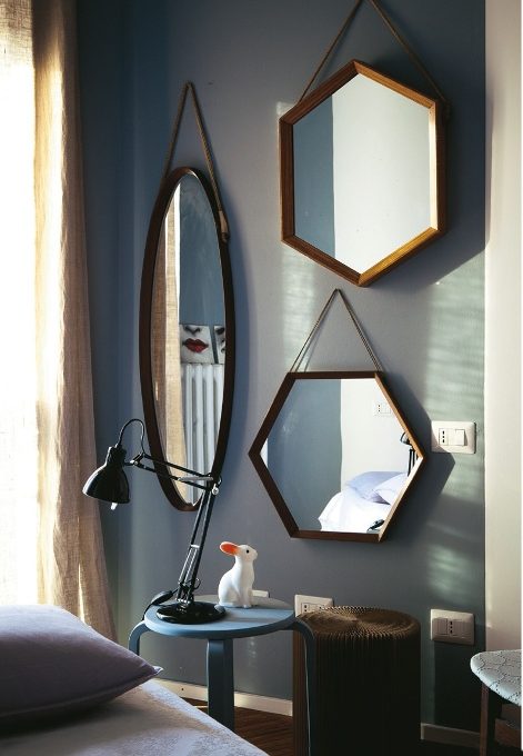 Gli specchi per me sono come quadri e mi piace scovarne di forme sempre diverse nei mercatini, per poi appenderli in composizioni equilibrate. Lampada JJ Junior di I Tre (da €235).