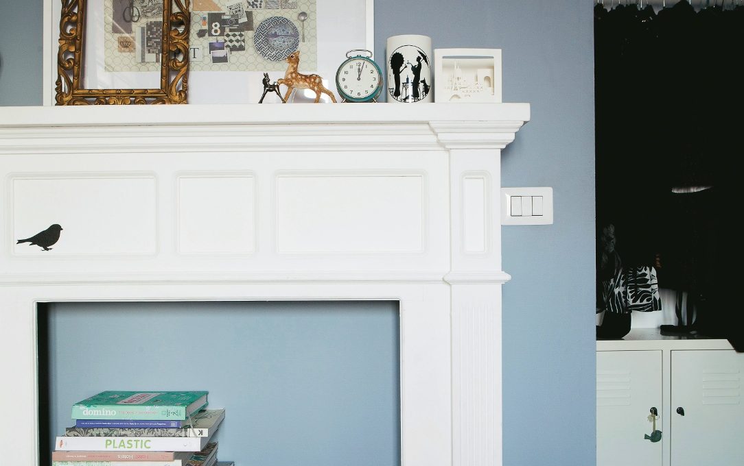 Certo, un camino vero sarebbe stata un’altra cosa, però, quando nel negozio di un rigattiere ho visto questa bellissima cornice in legno ho deciso che doveva essere mia. Così, l’ho dipinta di bianco e l’ho appoggiata alla parete che definisce la cabina armadio. Sul top, troneggia il quadro con la carta da parati che, assieme all’amica e collega Elisabetta Viganò ho disegnato per la prima CF’s Collection, (presentata alla mostra ‘Made in CasaFacile’ durante il fuorisalone 2012 a Cascina Cuccagna), accompagnato da una serie di animali e oggetti vintage. Sotto, ho impilato la mia collezione di libri di home décor che ho raccolto nei miei viaggi.