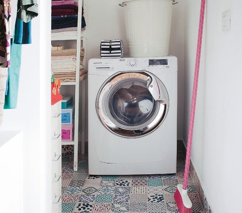 Con i lavori di ristrutturazione ho spostato il ripostiglio, che ora ospita la lavasciuga a profondità ridotta WDYNS 642 D di Hoover (cm 60x44x85h €749) più cassettiera, scaffale e bidoni in metallo di Ikea. Inoltre, ho ricavato una cabina armadio attrezzata con tubi e mensole, più due mobiletti in metallo Ikea PS di Ikea (cm 119x 40x63h €72,50 l’uno).