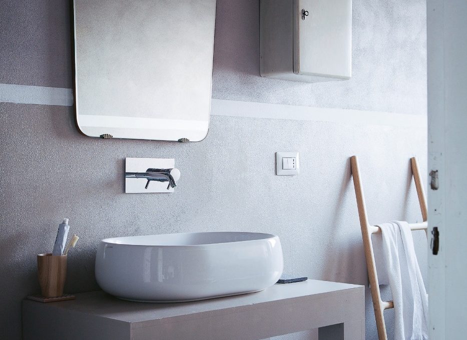 Anche nel bagno ho dato sfogo alle mie due passioni: il recupero e il fai da te. Sulla parete, dipinta con uno smalto lavabile color tortora, ho appeso uno specchio degli Anni ‘20. Al centro, il lavabo d’appoggio Nuvola di Azzurra Ceramiche (cm 60x40 €329,12) è fissato su una console in mdf che ho dipinto nella stessa nuance del muro. Il rubinetto è IB Rubinetterie, scaletta e portaspazzolini di Discipline, piastrelle di Made a Mano, come quelle del ripostiglio e della cucina. Applique Talo di Artemide (€198).