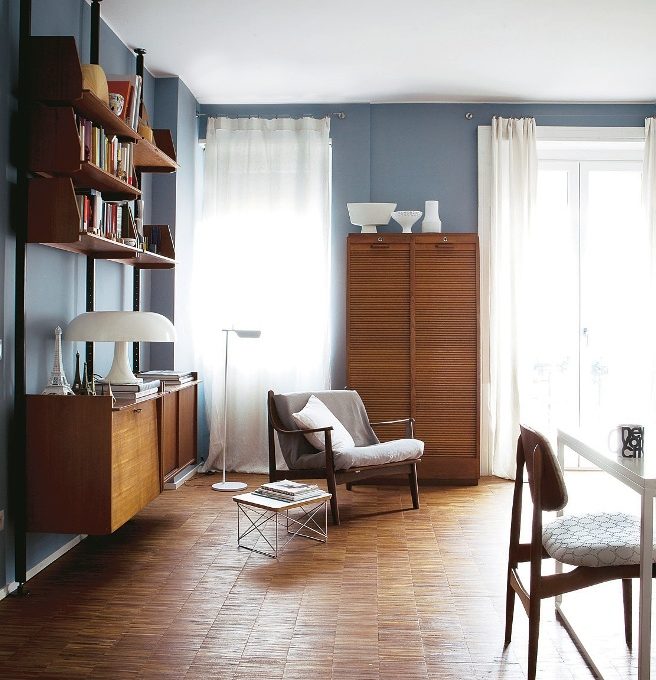 Tra le finestre, un mobile-office vintage. La pittura a parete, qui come in camera da letto, è CC 027.4 di Max Meyer, che mi è piaciuta per il bel tono azzurro un po’... polveroso.