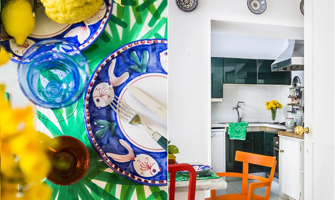 Un tocco di verde, ma anche di giallo e arancio, come gli agrumi dell’isola, rinfrescano la cucina. Sedia Café arancione [Billiani, cm 51x48,5x80,5h €280]; piatti [Solimene]; runner e tessuti [Livio De Simone]. I piatti decorati stanno bene a tavola e appesi a parete!