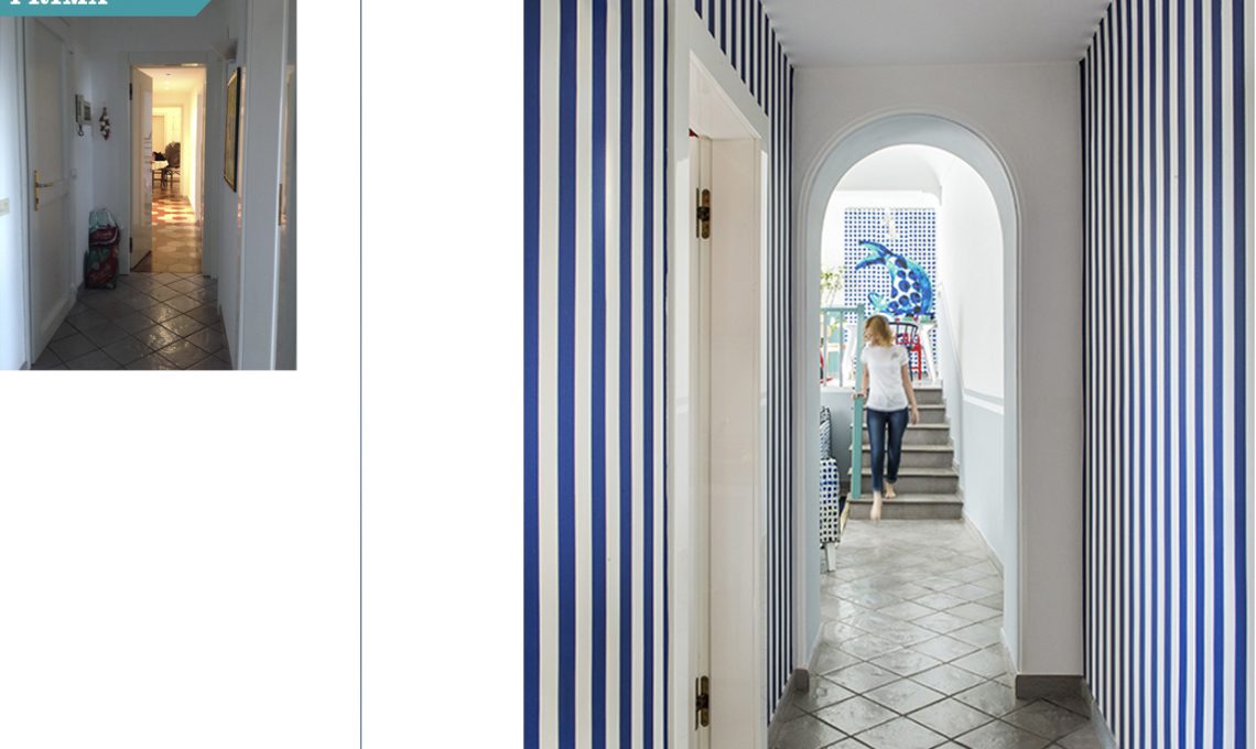 Stile Capri autentico! Con la tappezzeria a righe bianche&blu, anche il corridoio prende carattere isolano e diventa un ‘punto forte’ della casa. In più la Cfstylist nelle tante botteghe intorno ha trovato le cose 'giuste' per completarla.
