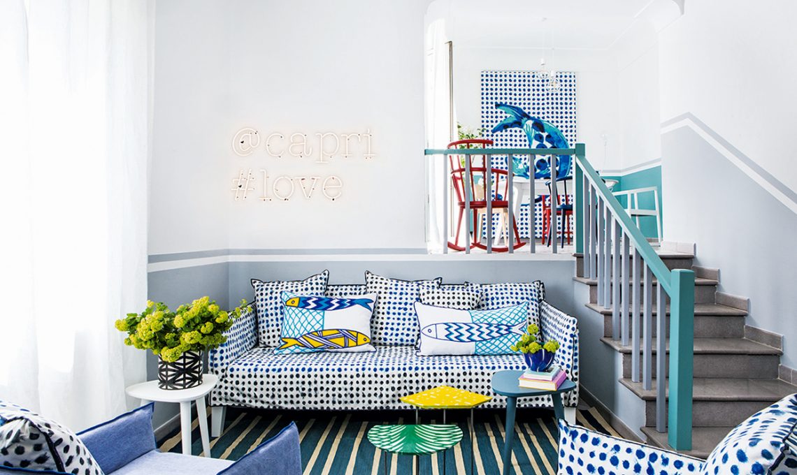 La scritta luminosa sul muro è una dichiarazione d'amore per Capri! Luci-lettere sulla parete [Seletti €41 cad]. Cuscini Orata e Barracuda [Livio De Simone], divano Up [da cm 220x92x82h da €2.519] di Gervasoni, come i tavolini Brick in legno bianco e avio [cm 42x40x49h da €409 cad]. Tappeto a righe [da Blu in via delle Botteghe 57, Capri].