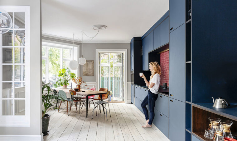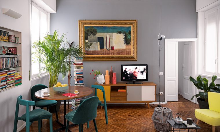 L'appartamento, dalla pianta a L, è stato rinnovato dai colori: il tono guida è il blu (con sfumature sul grigio e azzurro); per spezzarlo ci sono tocchi di rosso e giallo.