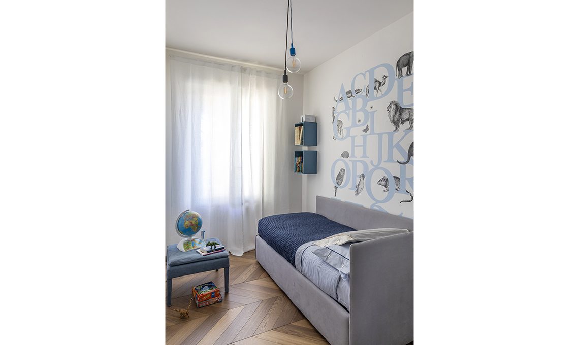 Armadio Woody [Nidi], sospensioni E27 [Muuto € 79]. Sul pouf azzurro MVN&1 [da Galleria Mia € 650], lampada Cap [Normann Copenhagen € 300].
