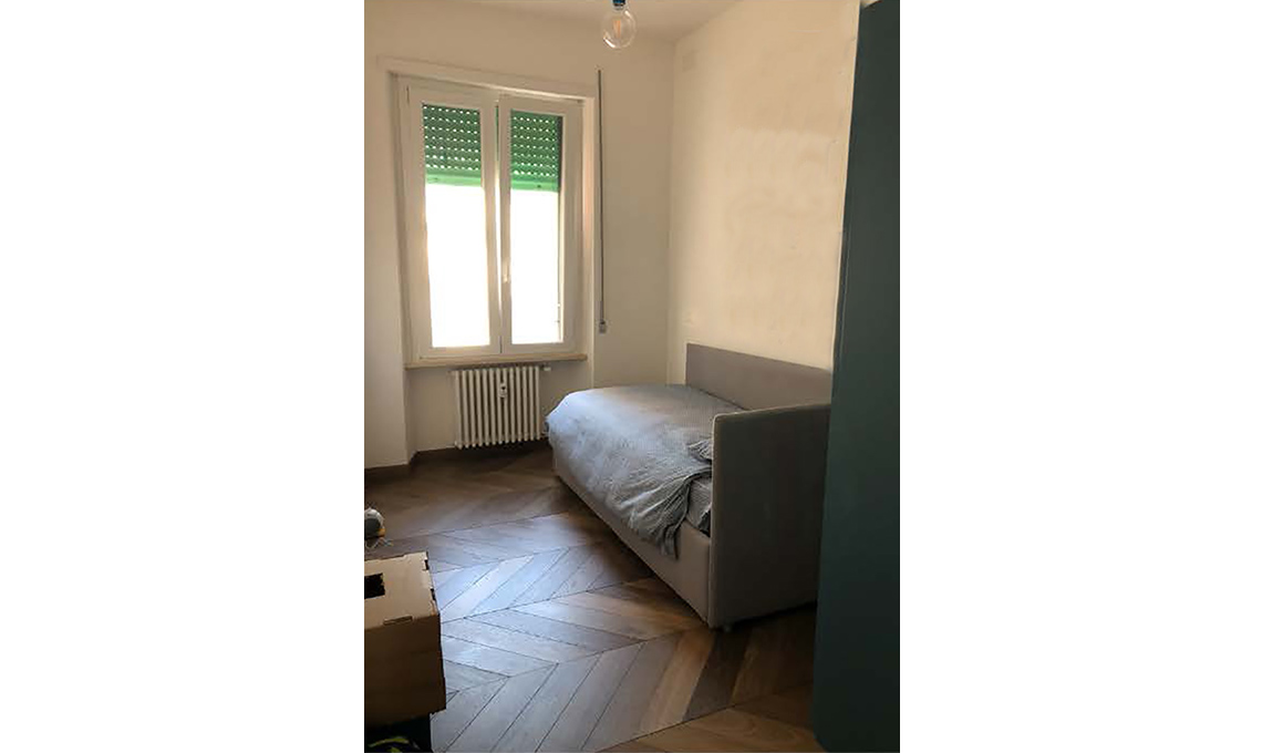 Sospensione [Piccola Bottega € 220]. Parquet Spina Chevron in rovere [Foglie d’Oro € 187/mq].
