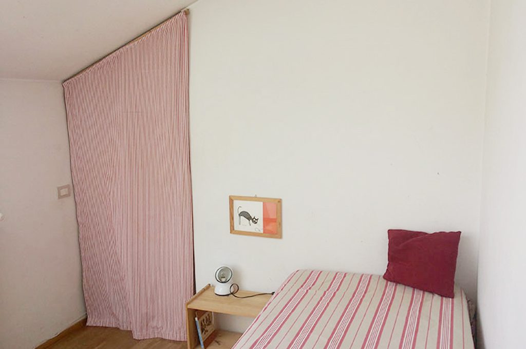 sottotetto della casa era una stanza mal sfruttata, con un letto singolo e una tenda che chiudeva la nicchia del ripostiglio.