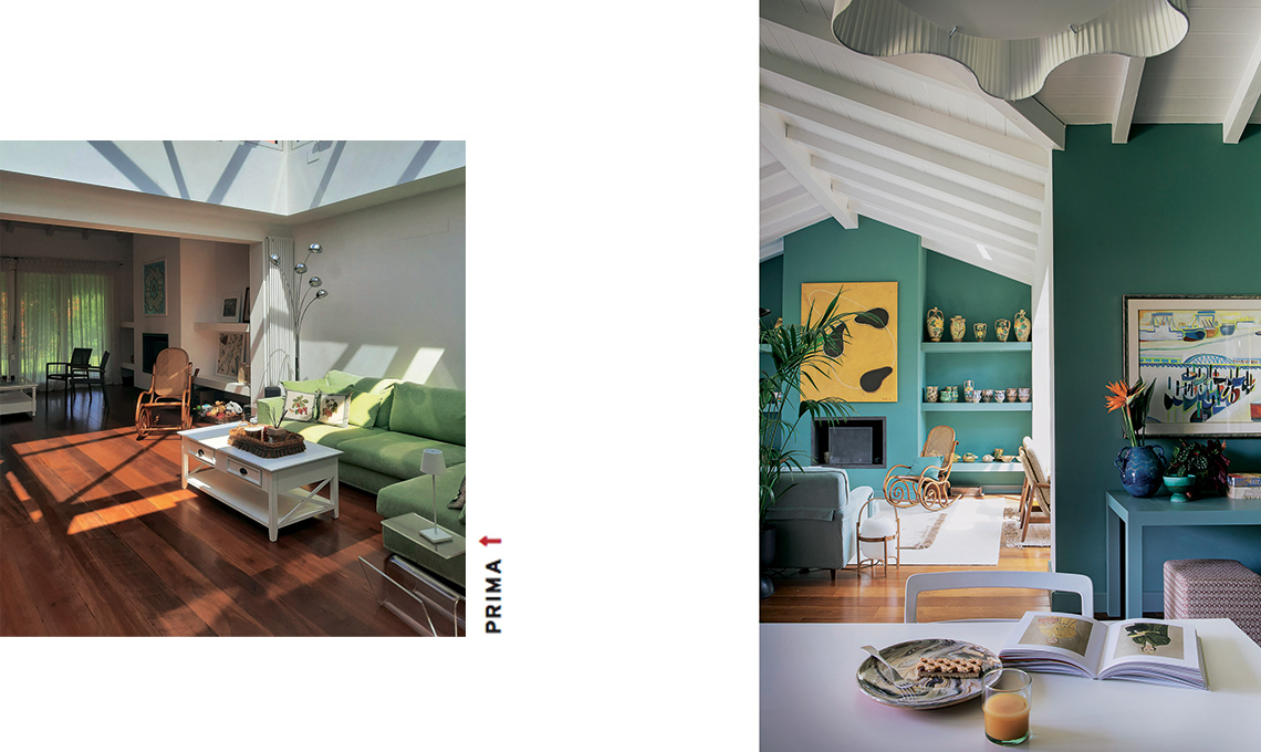 «I mobili lasciati dalla ex proprietaria erano in ottimo stato, quindi abbiamo chiesto a Vanessa di trovare un modo per rinnovarli in base al nostro gusto e di ridare un senso a tutta la casa in modo che diventasse ‘nostra’» racconta Ernesto, che aveva in mente una tonalità di verde precisa, vista durante un viaggio: Vanessa è partita proprio da quel colore, che ha usato per le pareti del camino e della sala da pranzo. Il resto della palette è venuto di conseguenza. «È stato fatto un grande lavoro con il tappezziere per rivestire sia gli imbottiti e i letti già presenti sia le poltrone vintage acquistate, tutto in tinte unite, vivacizzate dai cuscini» spiega Vanessa. «Il verde lago del soggiorno si attenua in cucina e nelle camere, fino a ‘inacidirsi’ nel lime della seconda sala».