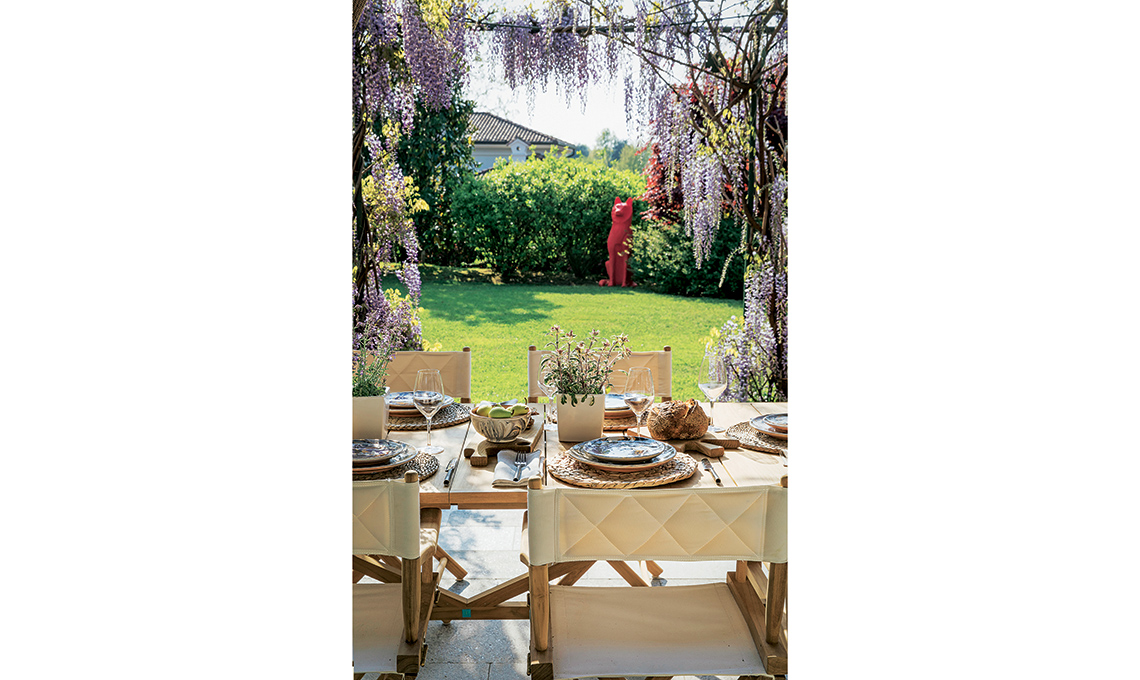 Il destino, a volte, fa splendide sorprese: «Dopo anni in affitto qui vicino (nel Golf Club di Bogogno), stavamo per comprare un’altra casa, quando un’amica a cena ci segnalò che una sua conoscente vendeva questa» racconta Maria Felice. «Il mattino dopo l’abbiamo vista e in men che non si dica l’abbiamo comprata! Io sono rimasta colpita dalla luce e dagli spazi dentro e fuori, il giardino è perfetto per ospitare gli amici; Ernesto si è innamorato del glicine che gira tutto intorno alla casa e del tetto a vetro sopra il salotto da cui ammirare il cielo giorno e notte».