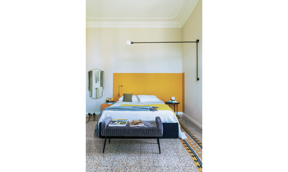 Lampada Potence Pivotante [Nemo € 714], comodino tondo [Maisons du Monde], letto vestito con lenzuola e plaid di [La Fabbrica del Lino], guanciali Perla in piume e piumino naturale [€ 34,30 cad] più piumone Montecatini imbottito con 100% piumino ungherese [cm 250x215 € 430], tutto [Cinelli Piume e Piumini], panca Lofty [Kare Design € 198]. Lampade da parete Roy [Viabizzuno] e Bijoux, a globo, sul comodino [Vesoi].