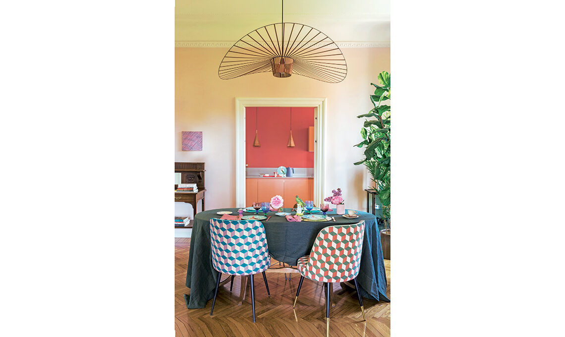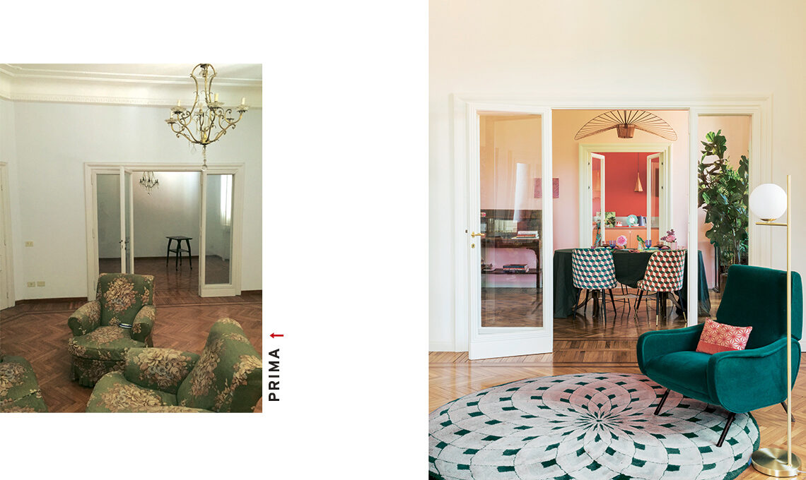 Salotto e sala da pranzo erano separati da una porta a vetri e la cucina, isolata, era accessibile da un disimpegno. Donatella e l’architetta Bertuglia hanno deciso di creare un gioco di prospettive aprendo la cucina sul pranzo con un’altra porta a vetri e creando dei piani di colore che dal salotto vanno caricandosi fino alla cucina, dal bianco, al rosa al geranio.