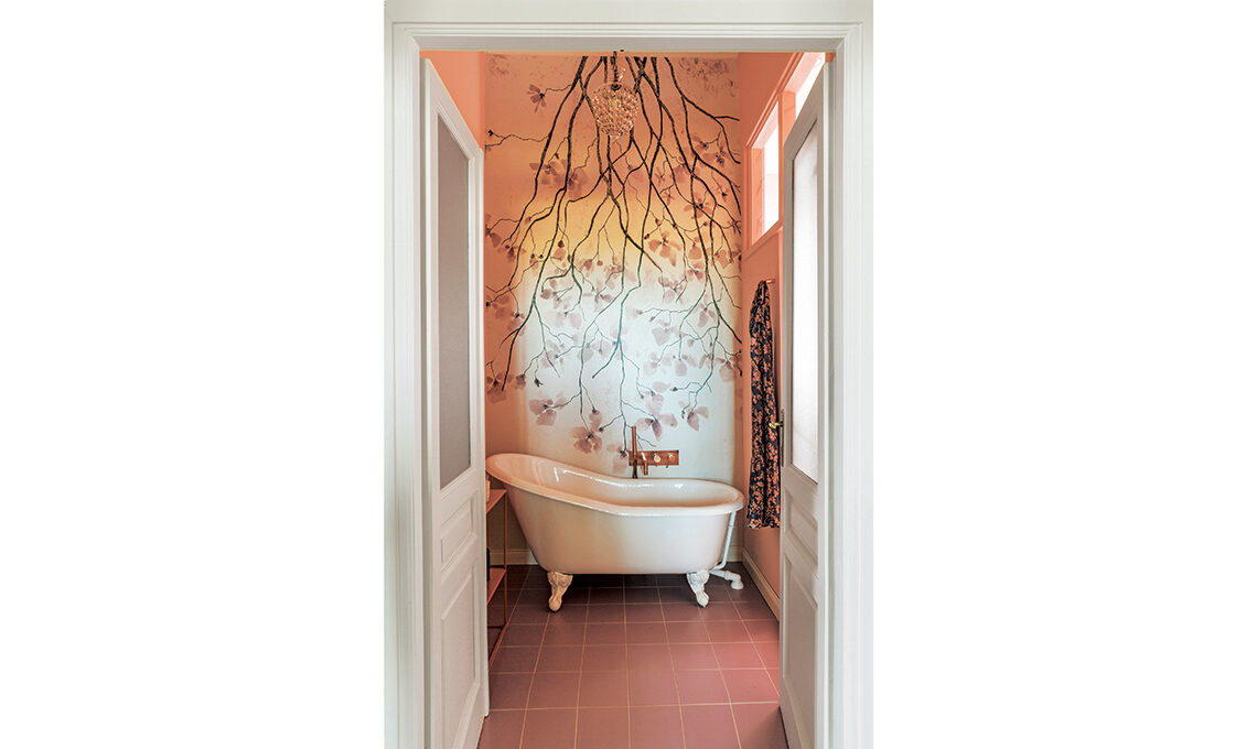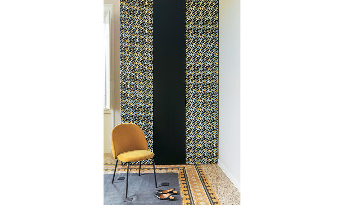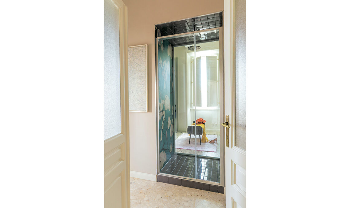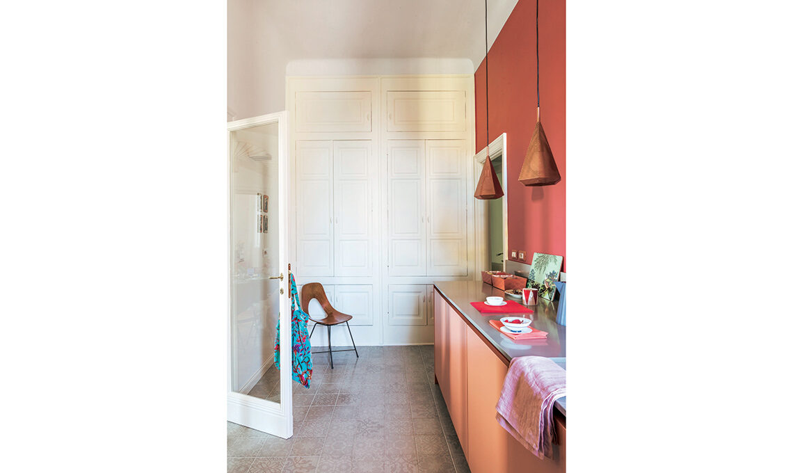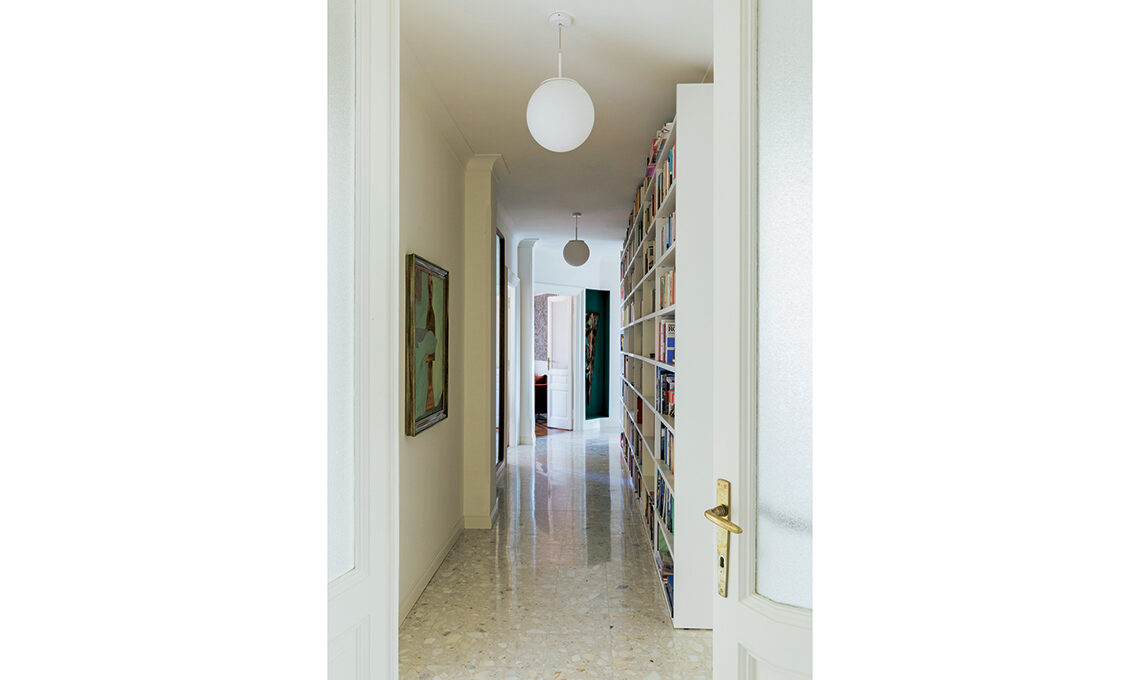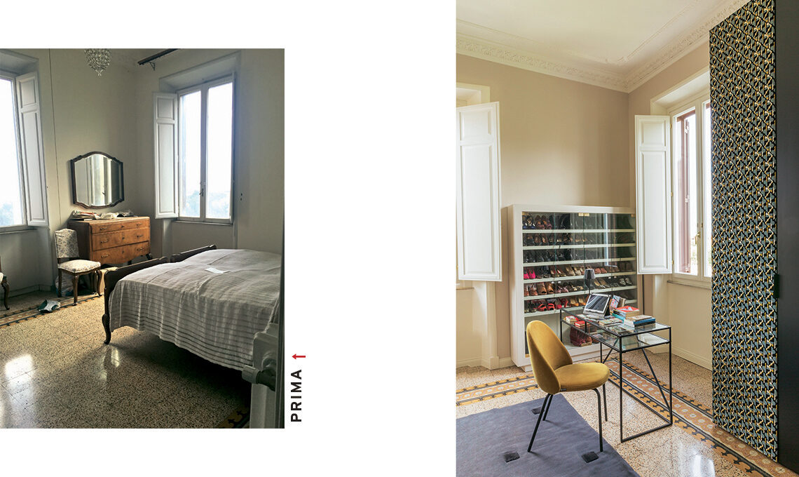 «L’architetta Francesca Bertuglia ha recuperato i pavimenti in graniglia nelle camere e il parquet a spina di pesce nel living e in studio, le porte interne quasi tutte a doppia anta vetrata, le decorazioni a stucco e i rosoni dei soffitti più 2 armadi/dispensa in cucina, restaurati. È stata mantenuta anche la distribuzione e funzione degli ambienti, con alcuni interventi all’insegna di una migliore fruibilità. Di nuovo ci sono l’apertura tra cucina e pranzo, grazie a una porta a vetri simmetrica a quella fra pranzo e salone, per creare una doppia prospettiva che culmina in una finestra da cui si vedono le montagne, da un lato, e il muro rosso della cucina incorniciato dalle porta vetrata come un sipario, dall’altro». La camera ospiti, vicino all’ingresso, ha ora il suo bagno privato, quella padronale ha cabina armadio, doccia a vista e un bagno grande e scenografico.