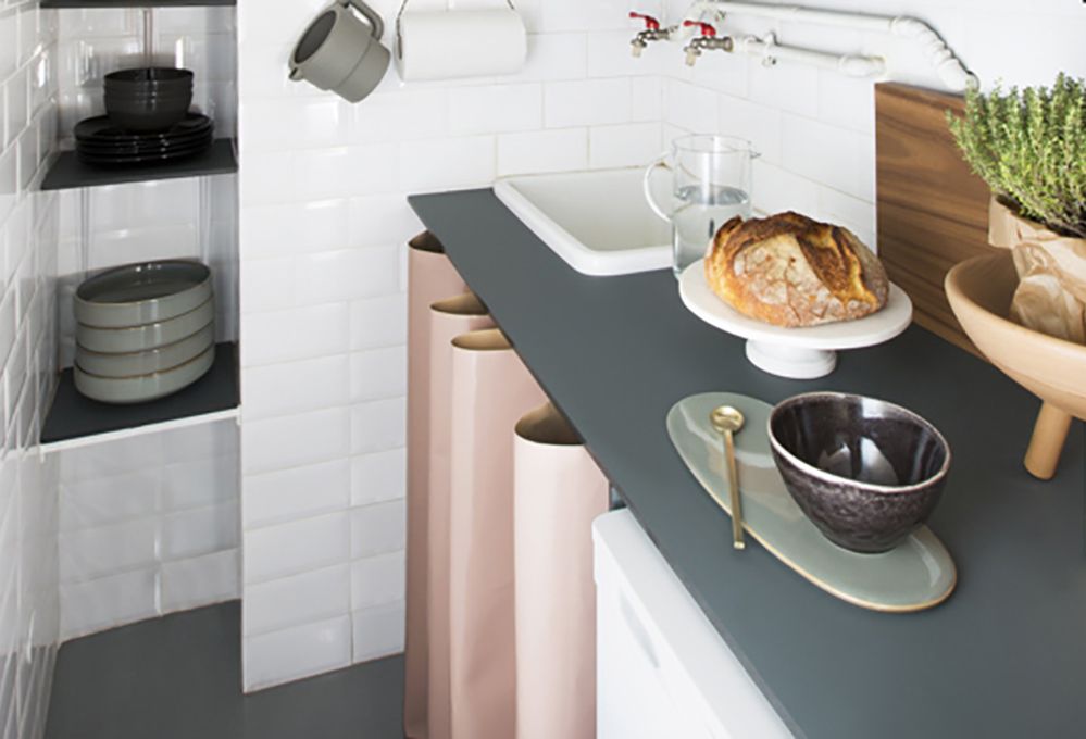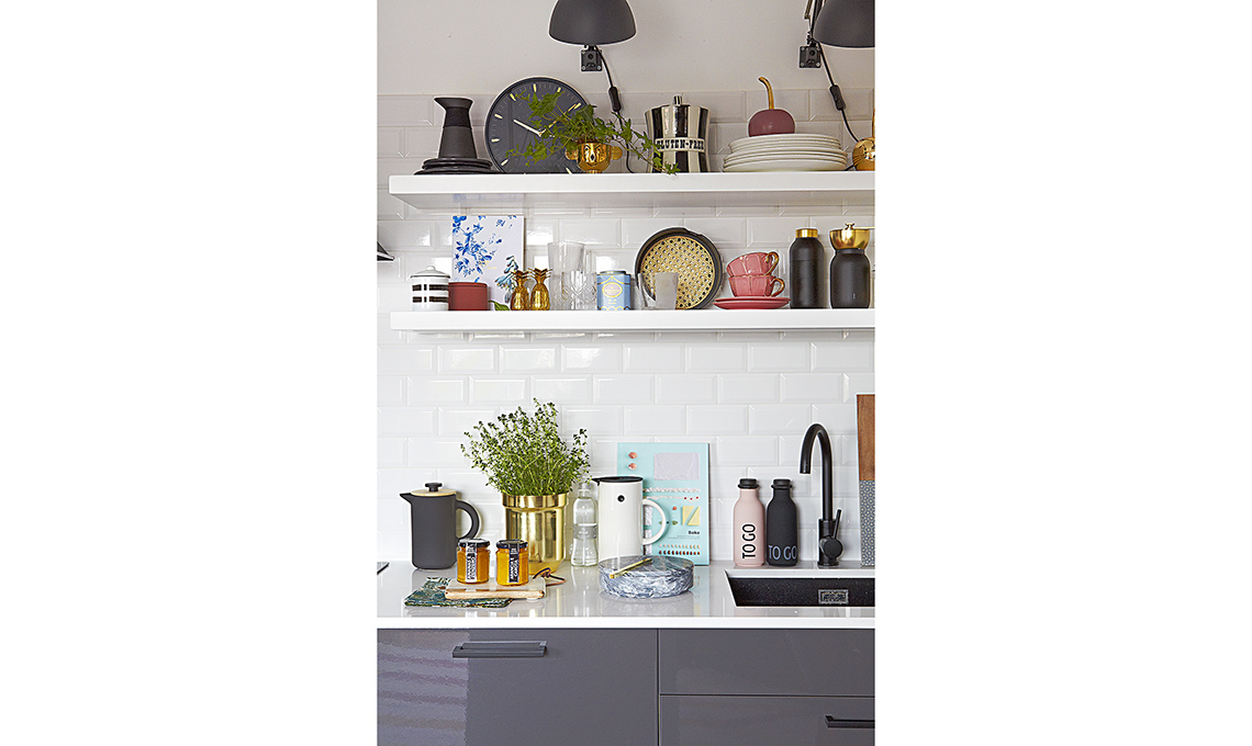 [Marazzi, cm 15x7,5]. lampade nere a parete [Ikea €7,99 cad], caffettiera e caraffa bianca [Stelton], cachepot oro [Ikea], scatola Dama [Incipit Lab], bottiglie termiche [laRinascente], tagliere