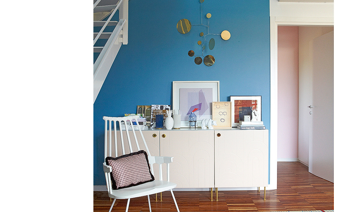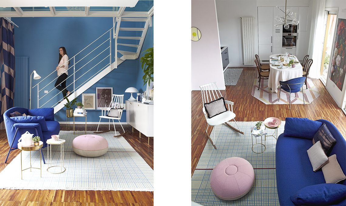 Il restyling è cominciato concentrandosi sul parquet che ha una venatura rossa che non piaceva più. La stylist Cristina Gigli ha suggerito di smorzarlo con dei toni freddi come il blu per la parete più grande della casa, quella della scala, e per il divano. Per addolcire l’insieme, tocchi di rosa pallido e dettagli in ottone, il metallo più trendy, immancabile a casa di una interior blogger!