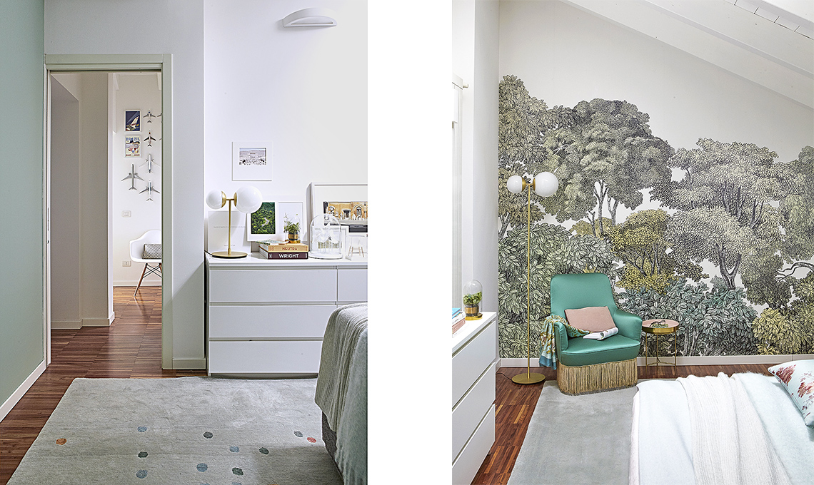 Se hai una camera in mansarda e ti piacciono la carta da parati, posala sul muro di fianco al letto per ampliare visivamente la stanza
